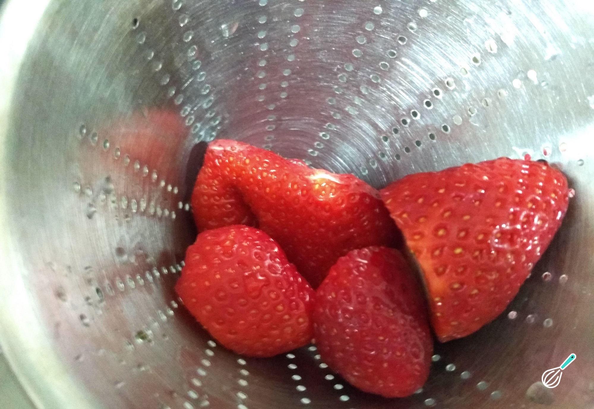 Retire a parte verde dos morangos e lave-os. Deixe que escorram e coloque-os em no liquidificador ou copo para o mixer.