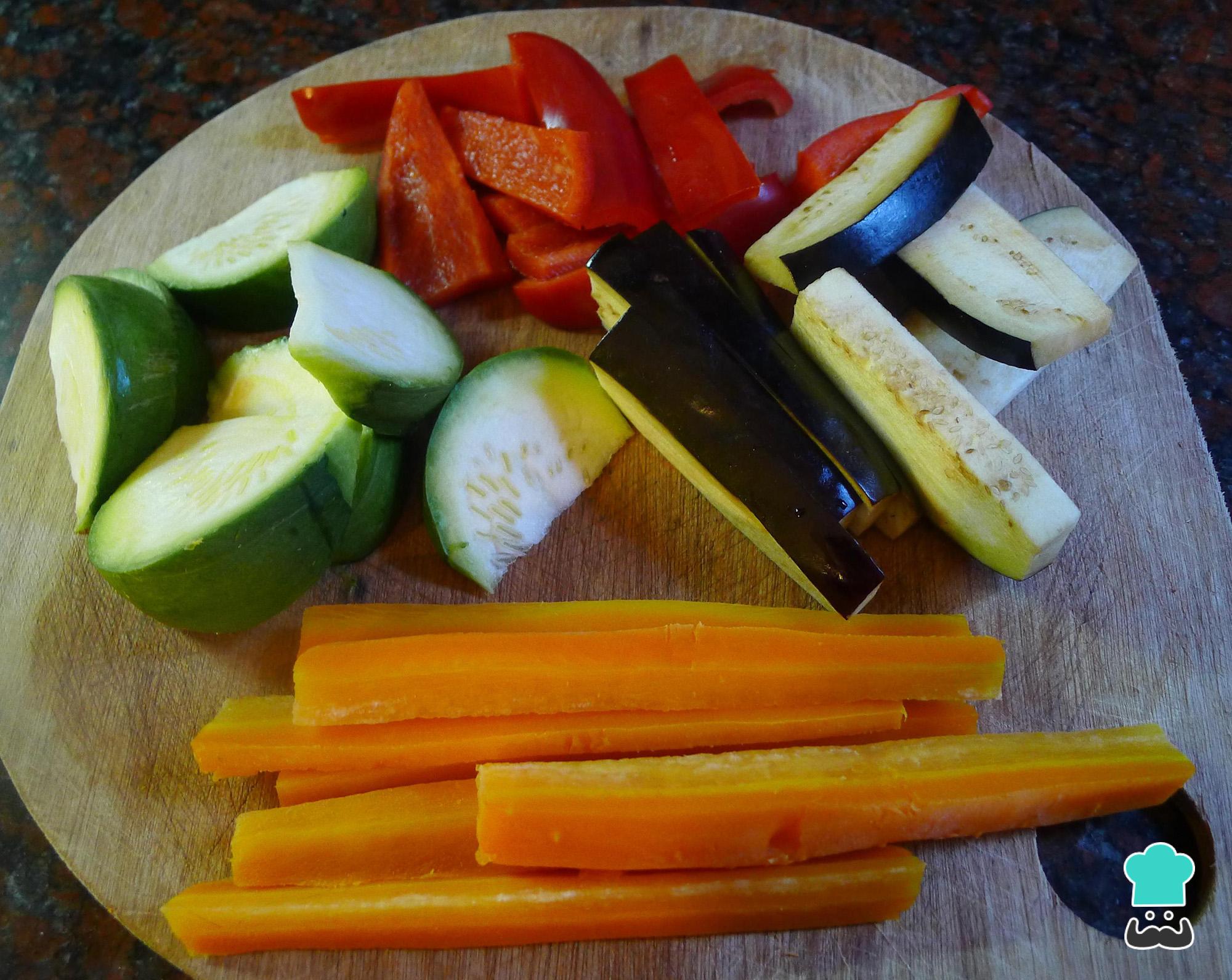 Lave bem os legumes, descasque as cenouras, retire as sementes do pimentão e corte todos em pedaços. Neste caso cortei a berinjela e abobrinha em rodelas e depois em meias luas, o pimentão em tiras e as cenouras em palitos.