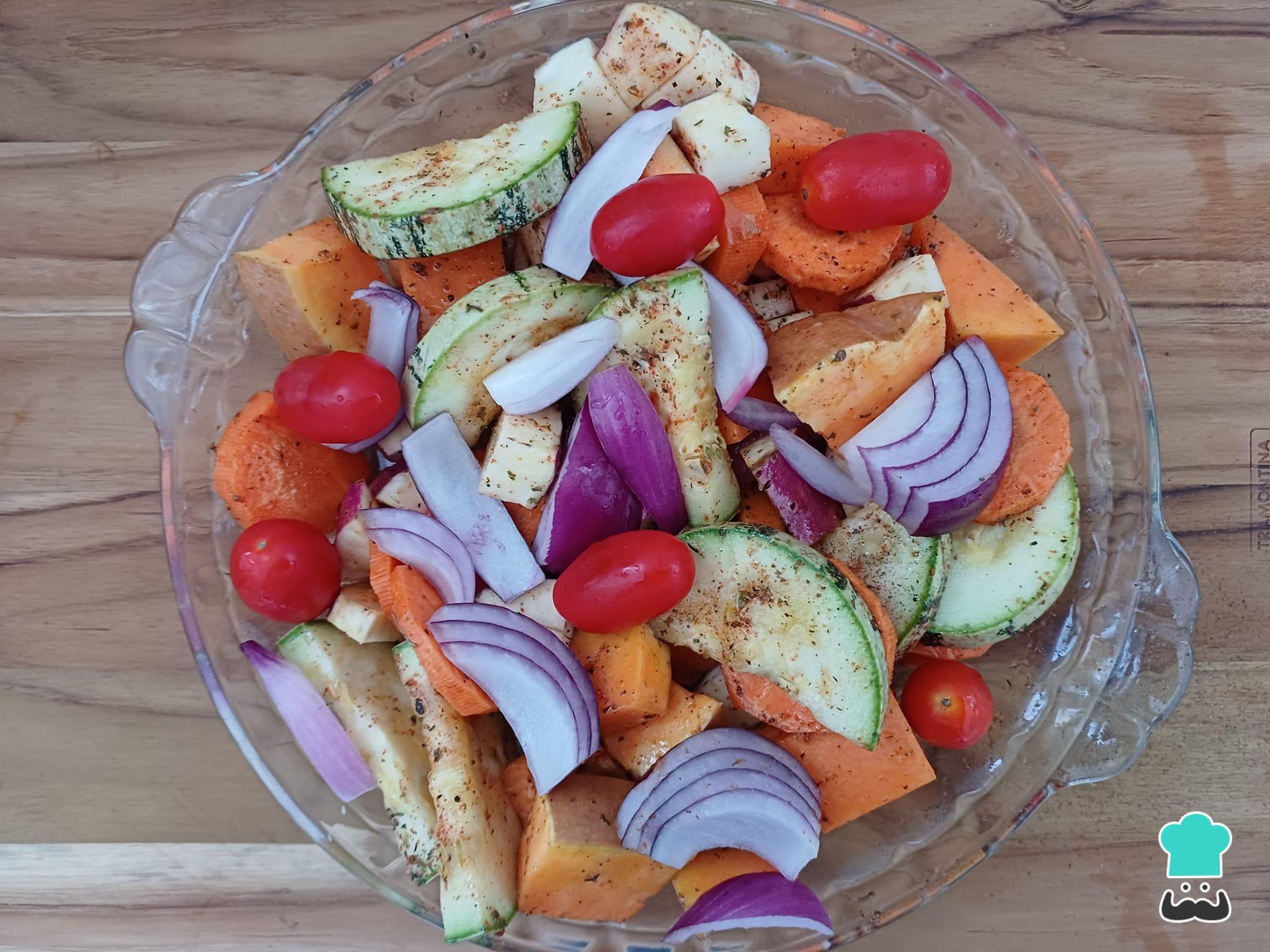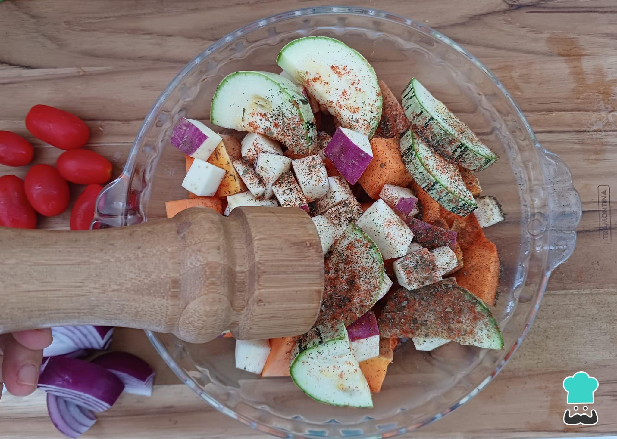 Num refratário, junte todos os legumes e tempere com sal, pimenta-do-reino, ervas finas e páprica.