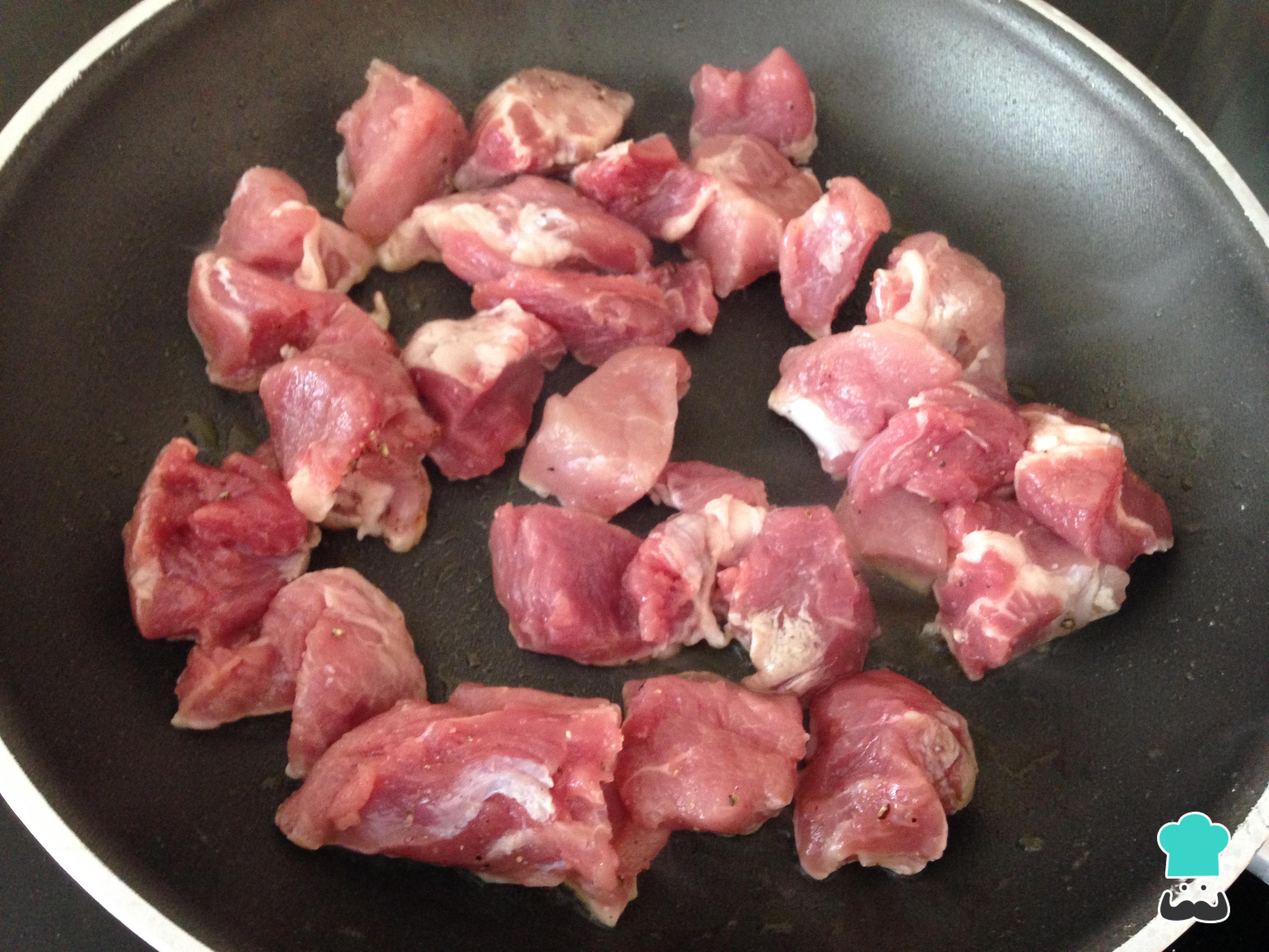 Refogue a carne de porco picada em uma frigideira com um pouco de azeite de oliva. Tempere com sal e pimenta do reino e reserve.