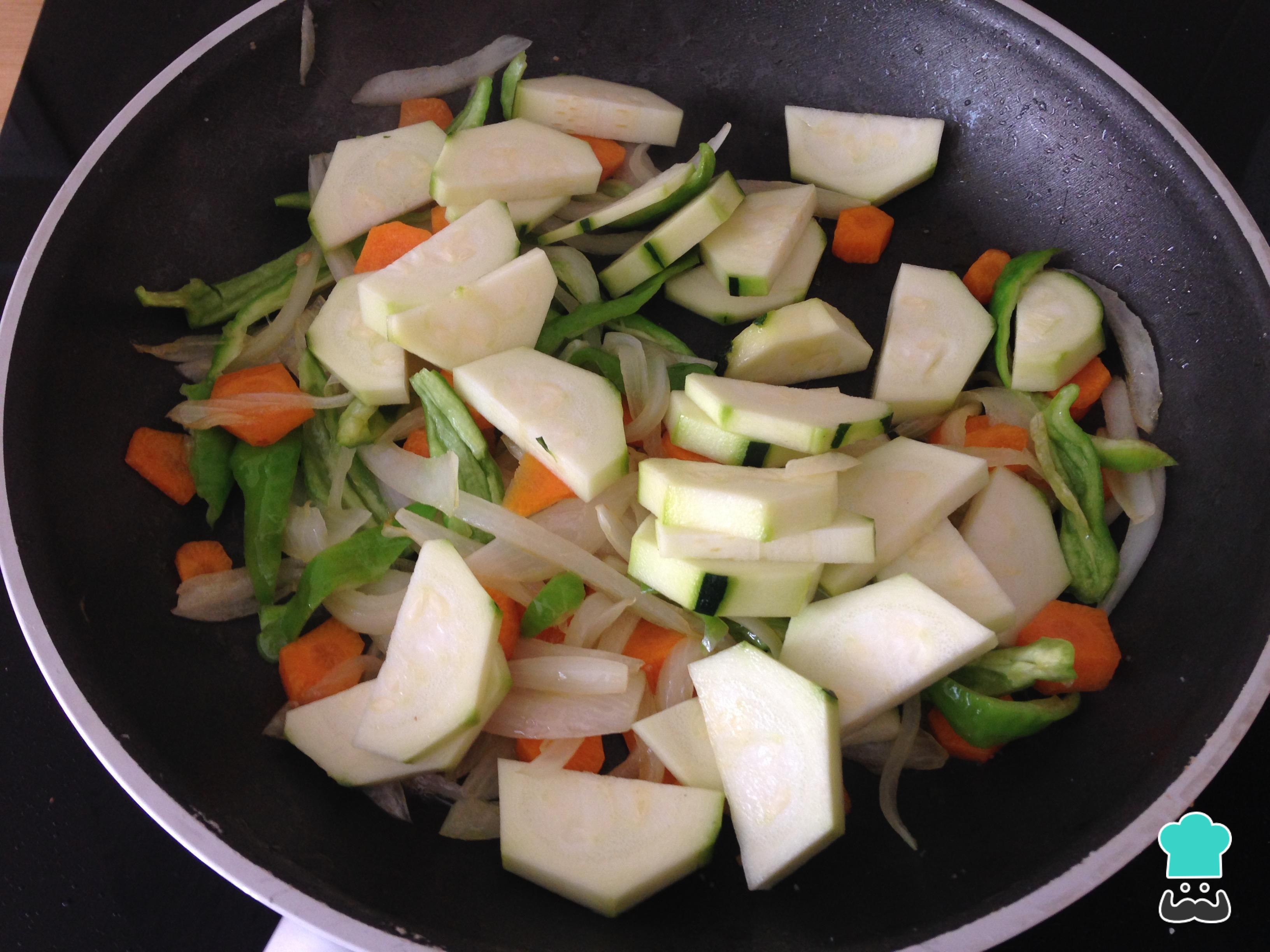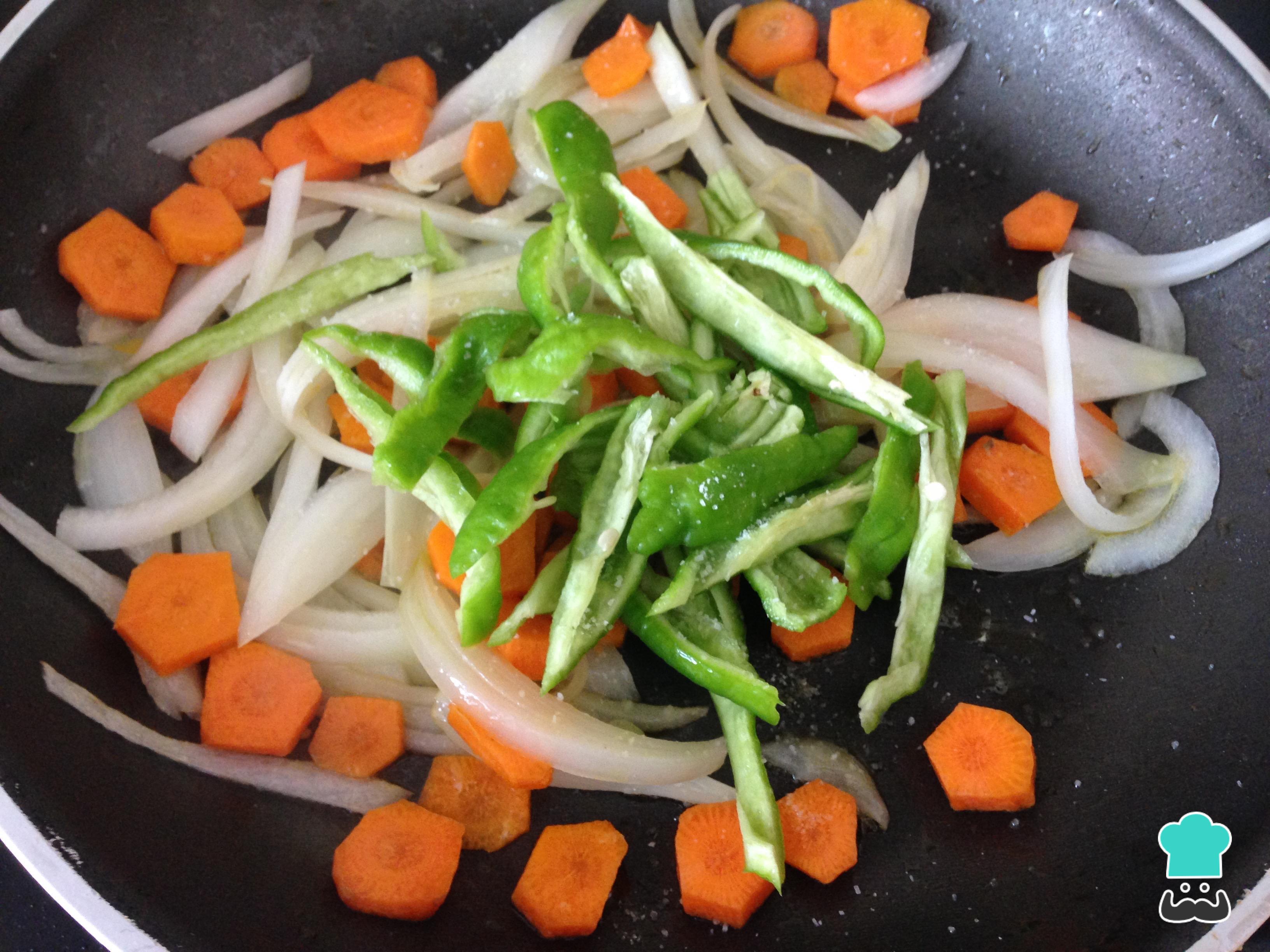 Corte os legumes: a cebola e a pimenta em tirinhas juliana e a cenoura em fatias. Refogue a cebola, o pimentão e a cenoura com um fiozinho de azeite. Tempere com sal e pimenta.