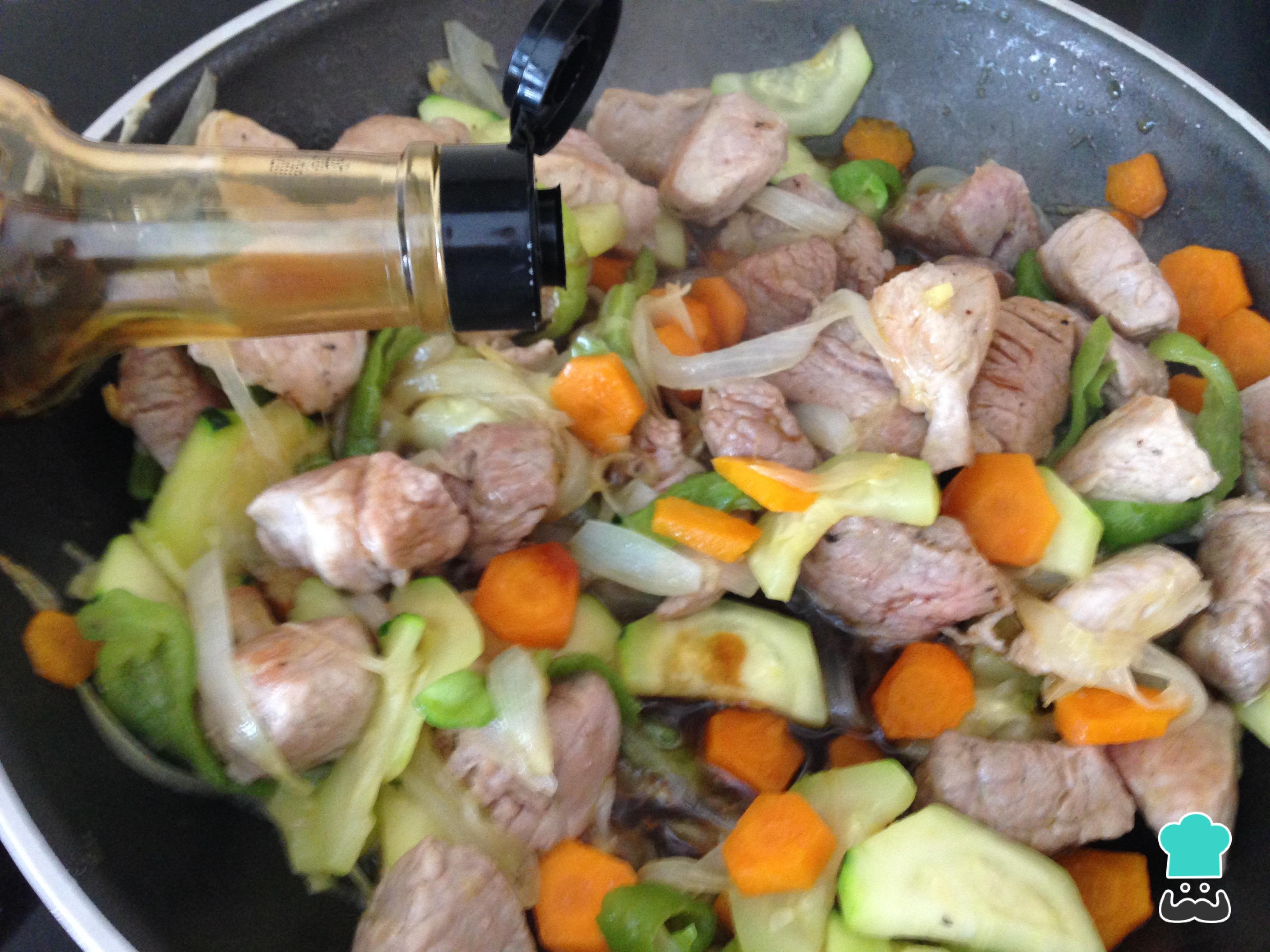Adicione uma pitada de molho shoyu à carne com legumes salteados e deixe cozinhar por alguns minutos.