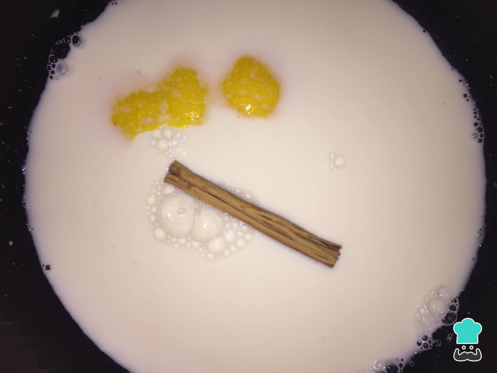 Coloque o leite, o pau de canela, a casca de lima em uma panela e leve ao fogo até ferver.
