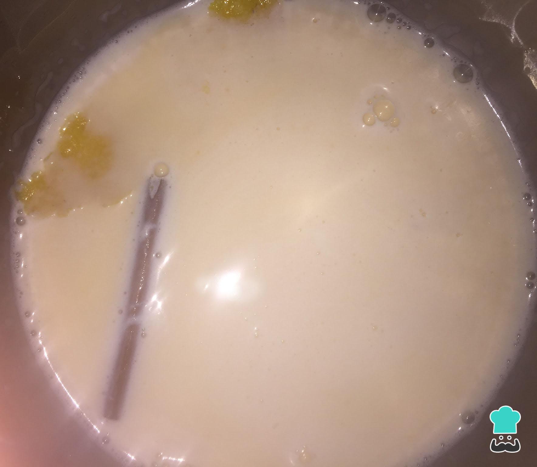 Depois do leite levantar fervura, adicione o preparado das gemas ao leite. Mexa durante um minuto e retire o pau de canela e a casca de lima.