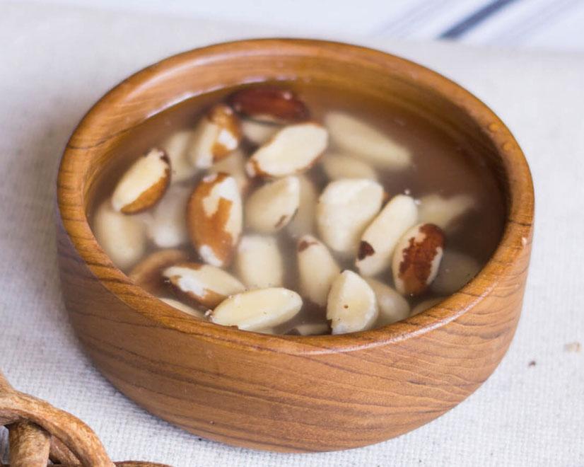 Hidrate as castanhas do pará de um dia para o outro em água em temperatura ambiente com uma pitada de sal ou, no mínimo, por 3 horas. Assim elas ficarão mais macias e fáceis de fazer para obter esta bebida de castanha.