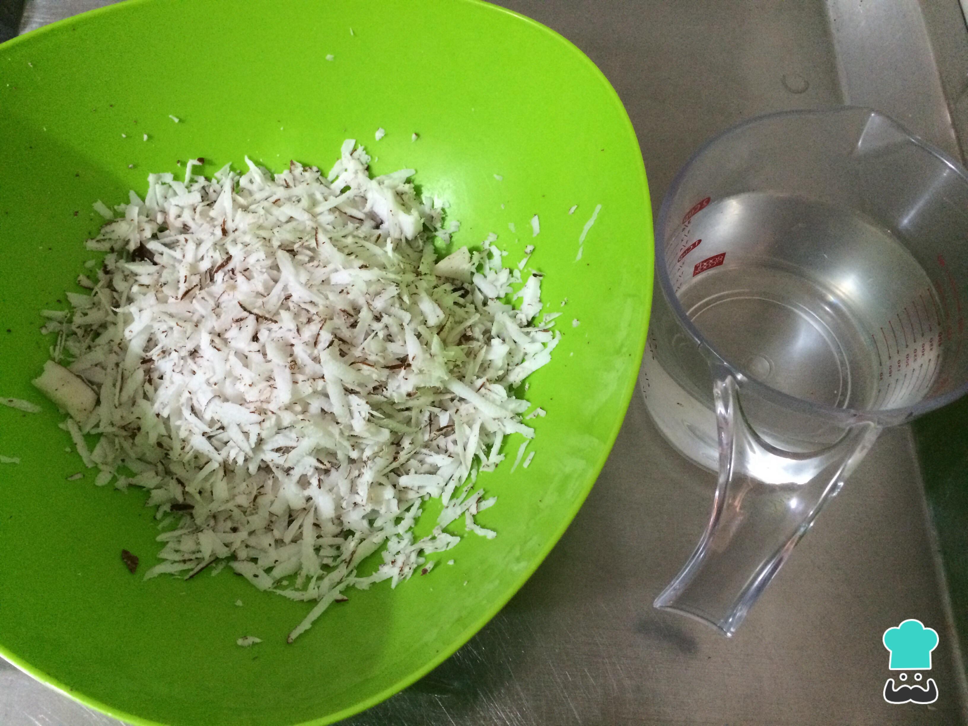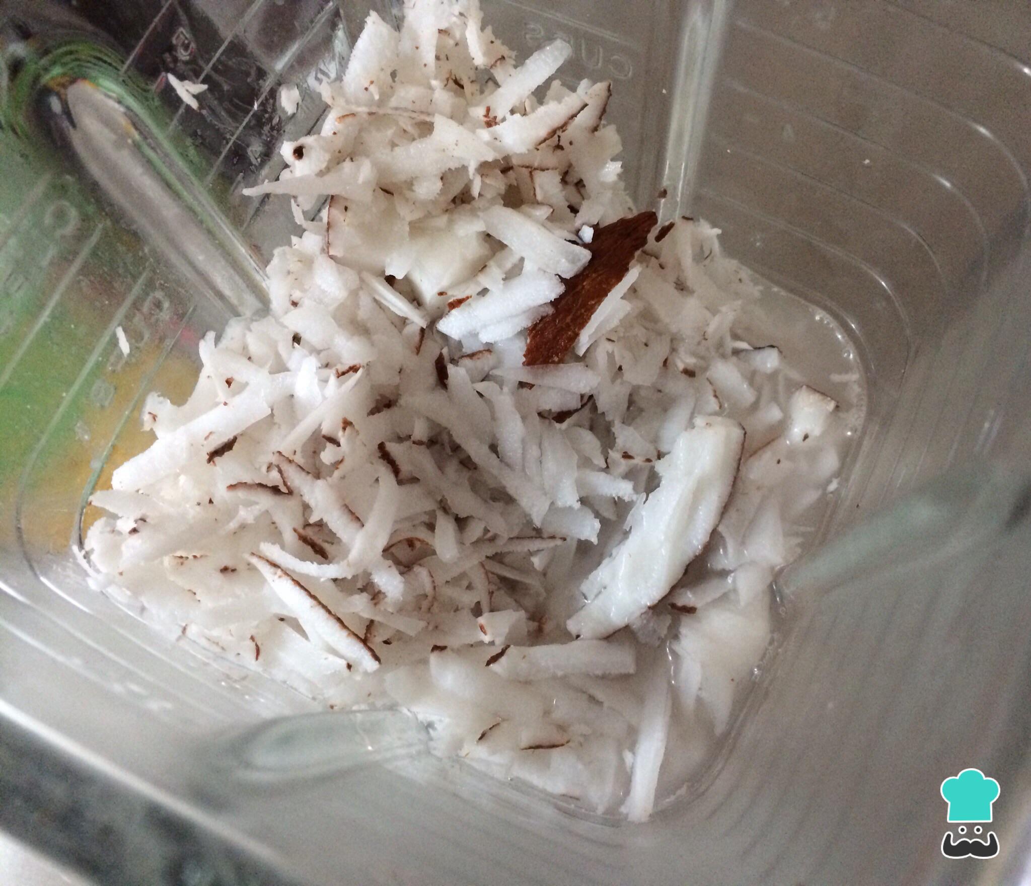 Parta o coco com força, com a ajuda de um martelo, reserve a água que está no seu interior e com uma faca sem ponta retire toda a sua polpa. Agora é o momento de ralar o coco e colocar no liquidificador com a água quente.