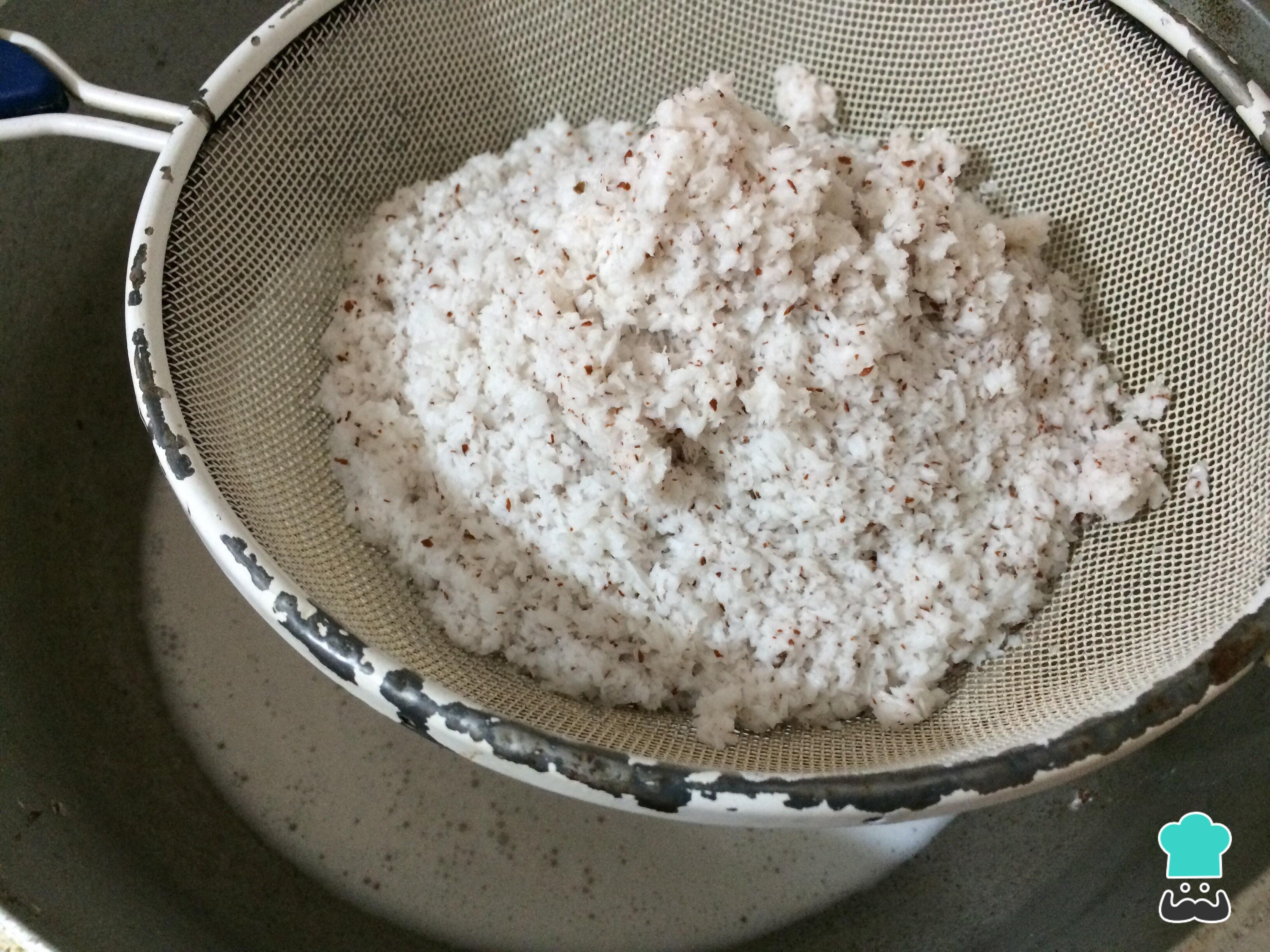 Filtre o leite de coco com a ajuda de uma colher para espremer tudo muito bem. Se pretender pode voltar a triturar o que resta do coco com mais um pouco de água, com isso obterá um leite um pouco menos concentrado.