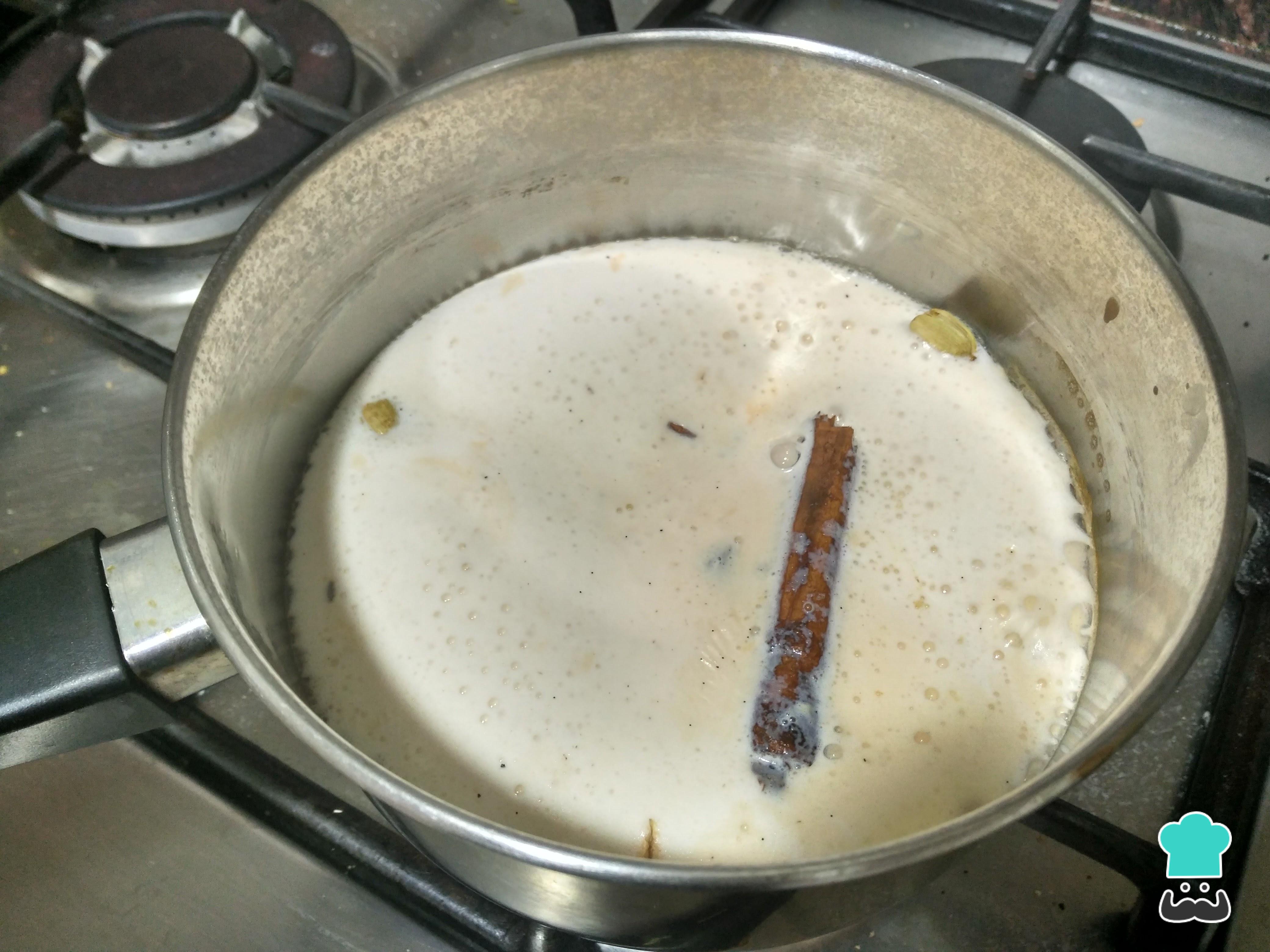 Leve ao fogo médio uma panela com o leite, o pau de canela, as sementes da vagem de baunilha e os grãos de cardamomo abertos (para que libertem mais rapidamente suas propriedades). Baixe o fogo quando observar que o leite está começando a ferver.