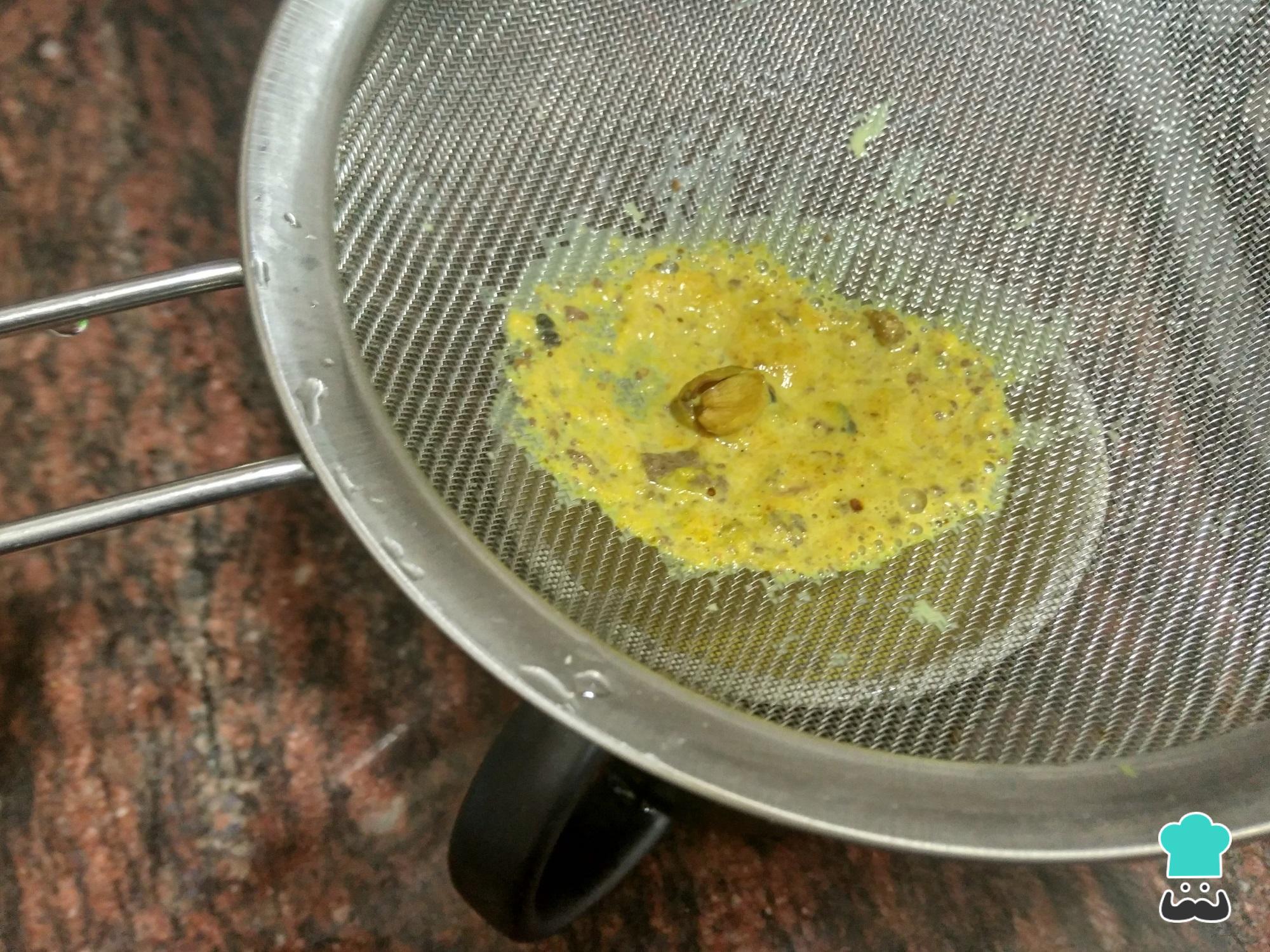 Após o tempo indicado passe o leite por uma peneira, para filtrar todos os pedaços, e coloque em duas xícaras.