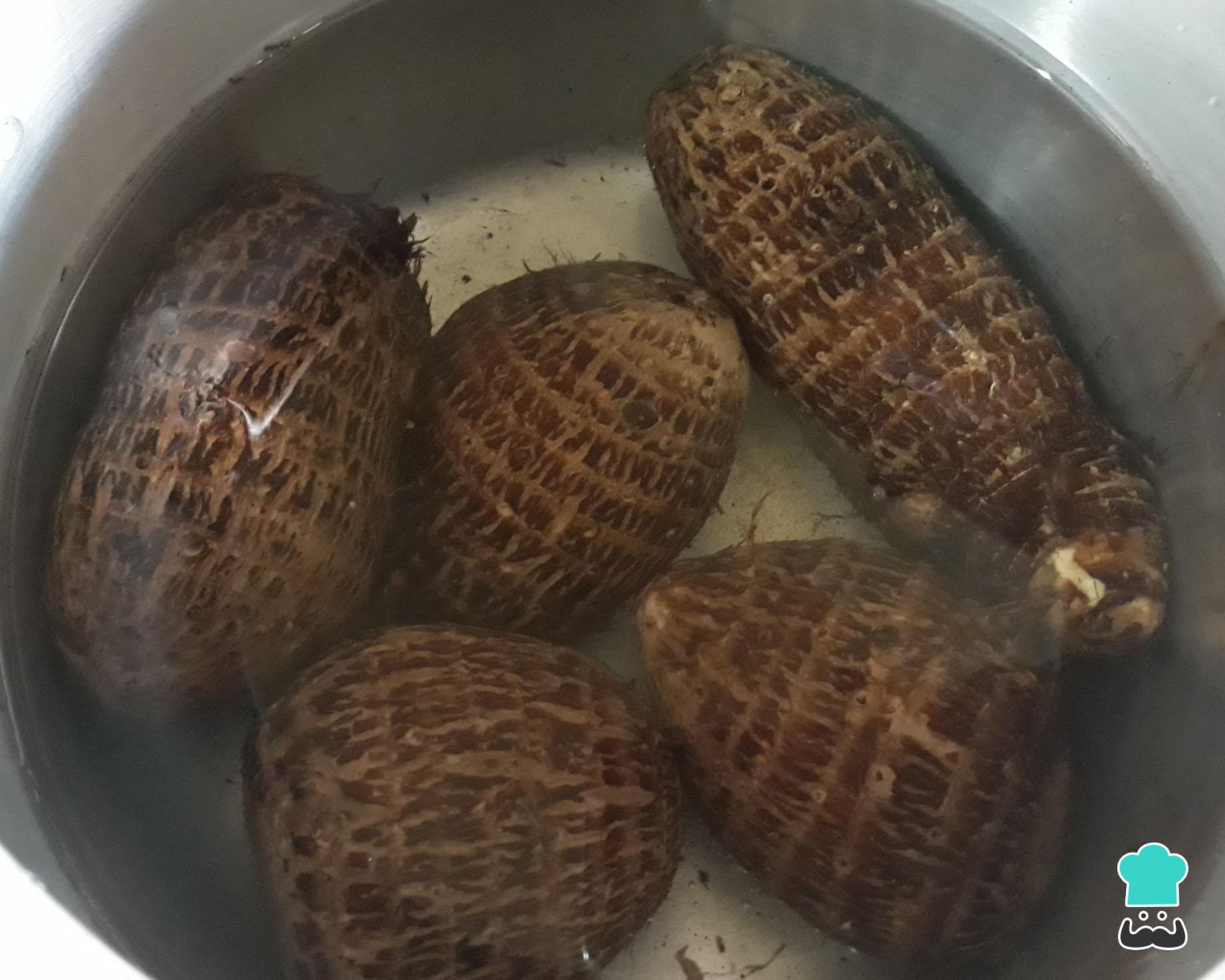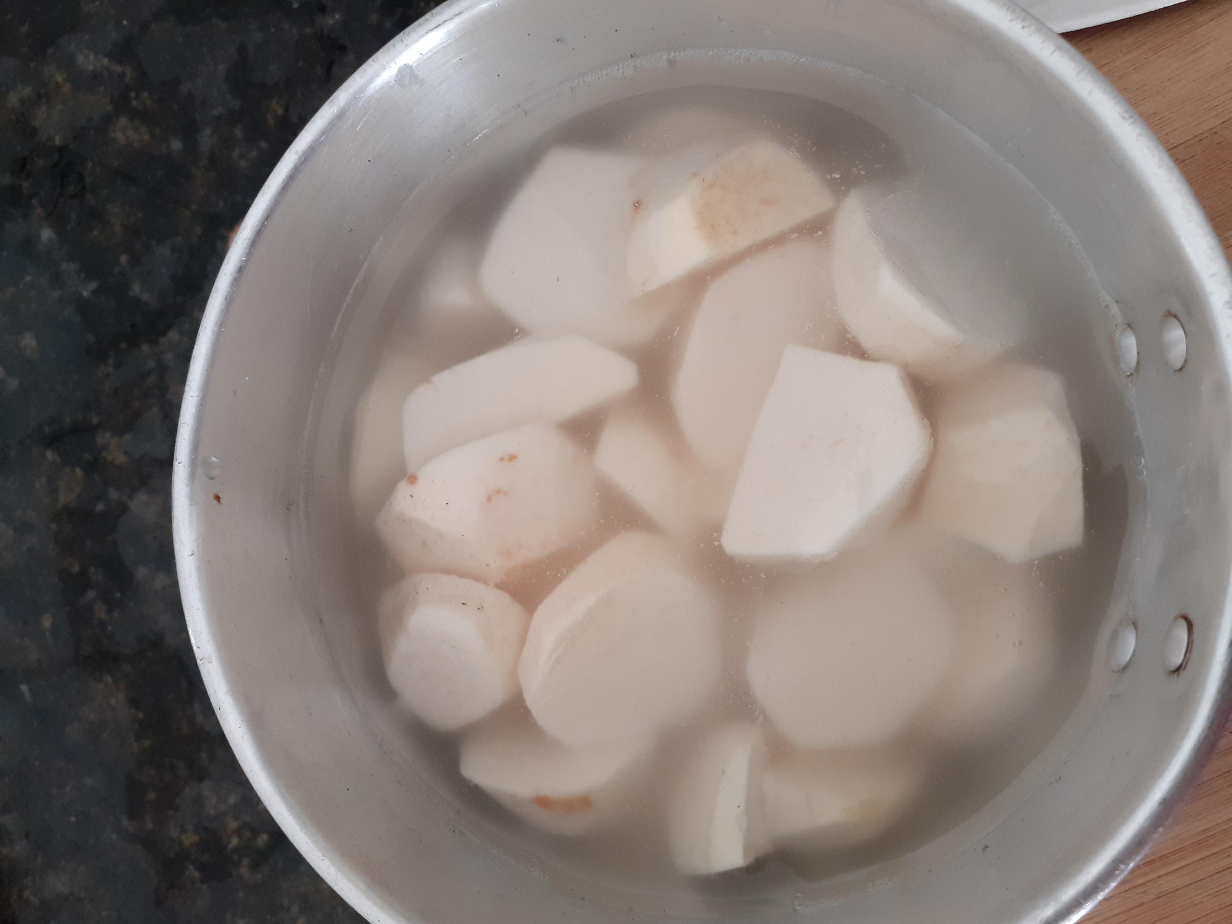 - Corte o inhame em cubos grandes, coloque em um recipiente e cubra com água filtrada;