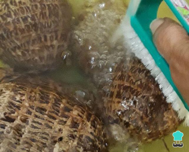 Primeiramente lave bem o inhame sem descascar com água corrente - isso é importante para ele não soltar a baba, que pode provocar irritação e alergia na pele. Use uma escova pequena para eliminar toda a sujeira.