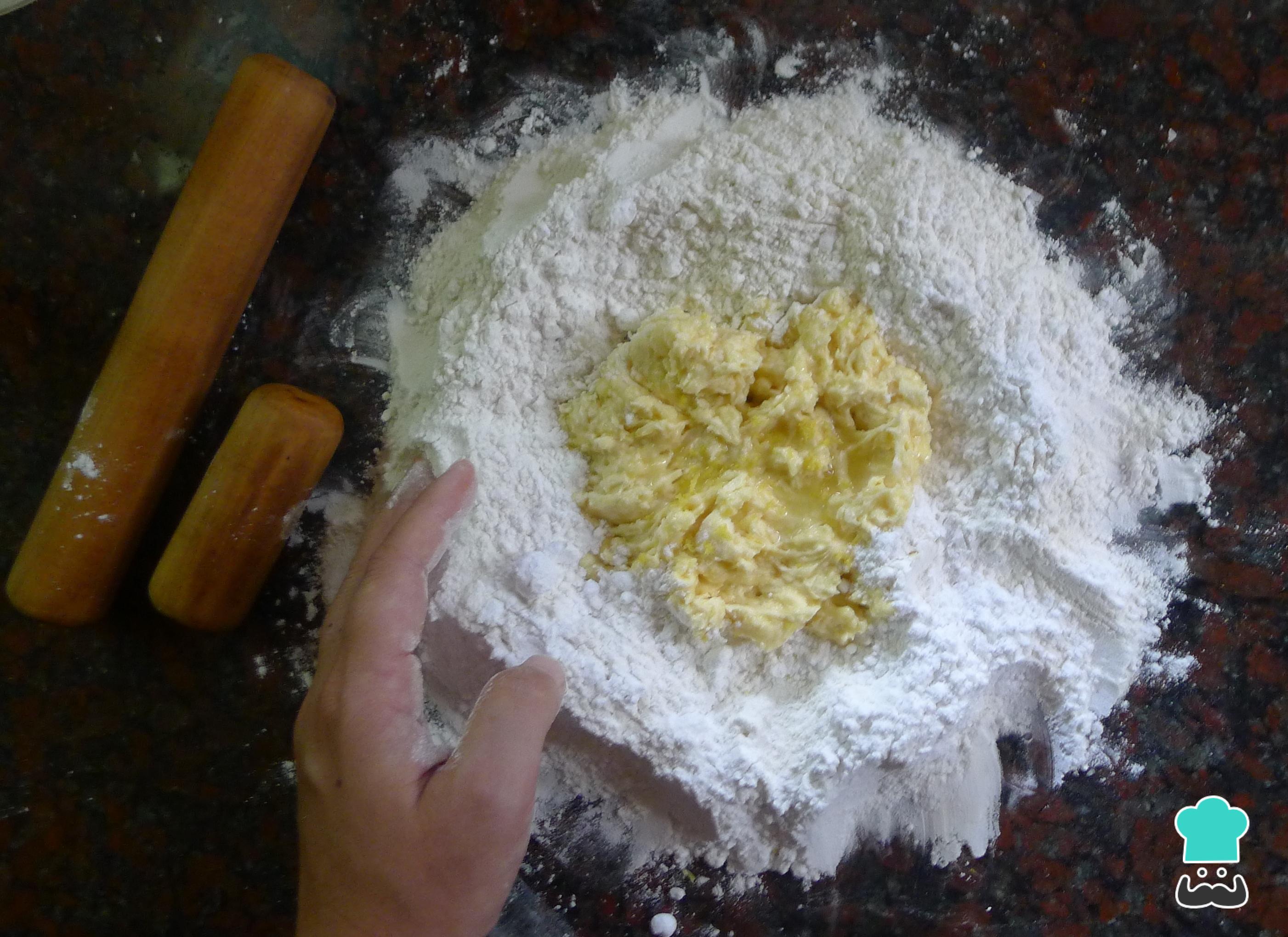 Para preparar o bolo, faça uma coroa com farinha na bancada. Misture a manteiga, o açúcar, as gemas e as raspas de limão e despeje no centro da coroa. Amasse tudo até obter uma massa homogênea e deixe repousando na geladeira por 20 minutos.