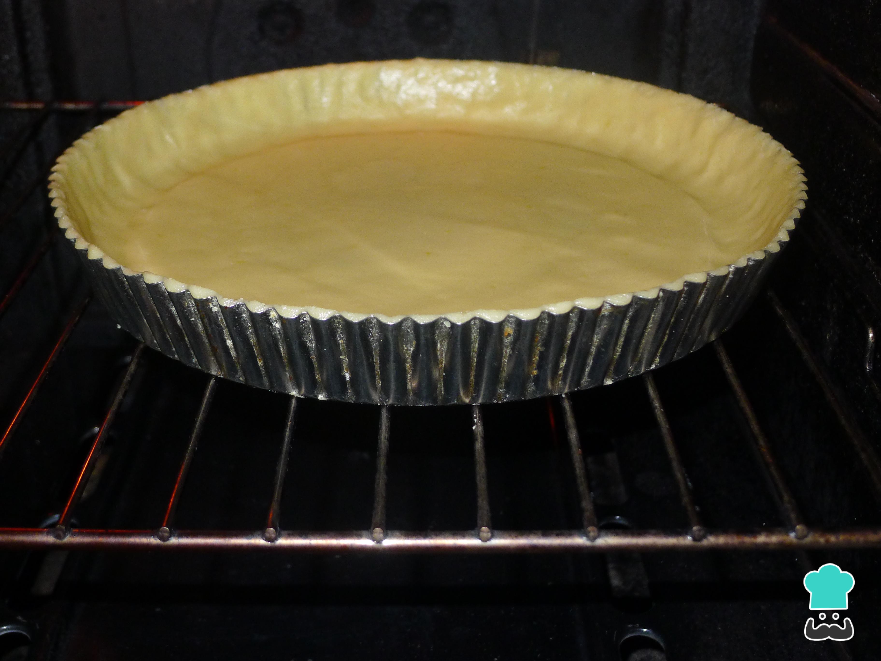 Ligue o forno a 180 ° C. Unte e enfarinhe uma forma de torta com 26 cm de diâmetro e estenda a massa sobre ela. Asse até dourar (cerca de 20 minutos), retire do forno e reserve.