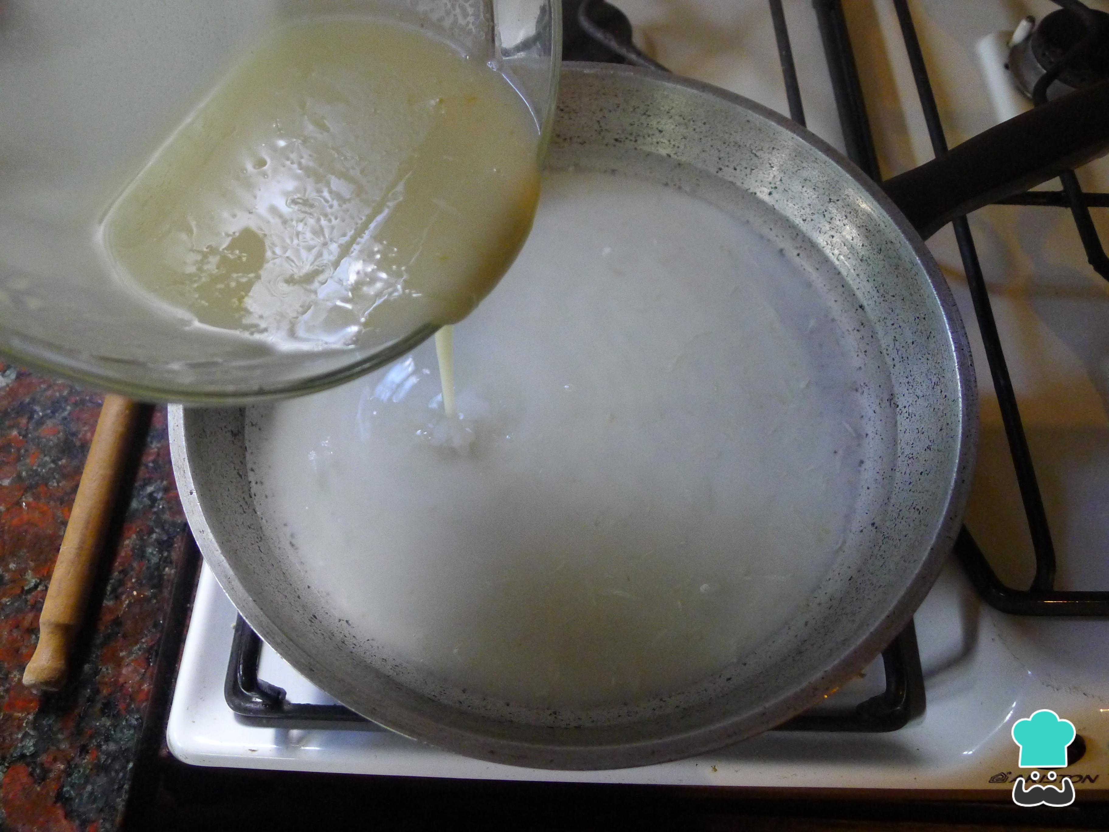 Para preparar o creme de limão, aqueça a água em uma frigideira e adicione o amido de milho e açúcar dissolvidos no suco de 2 limões. Leve a fogo baixo, mexendo continuamente com uma colher de madeira.