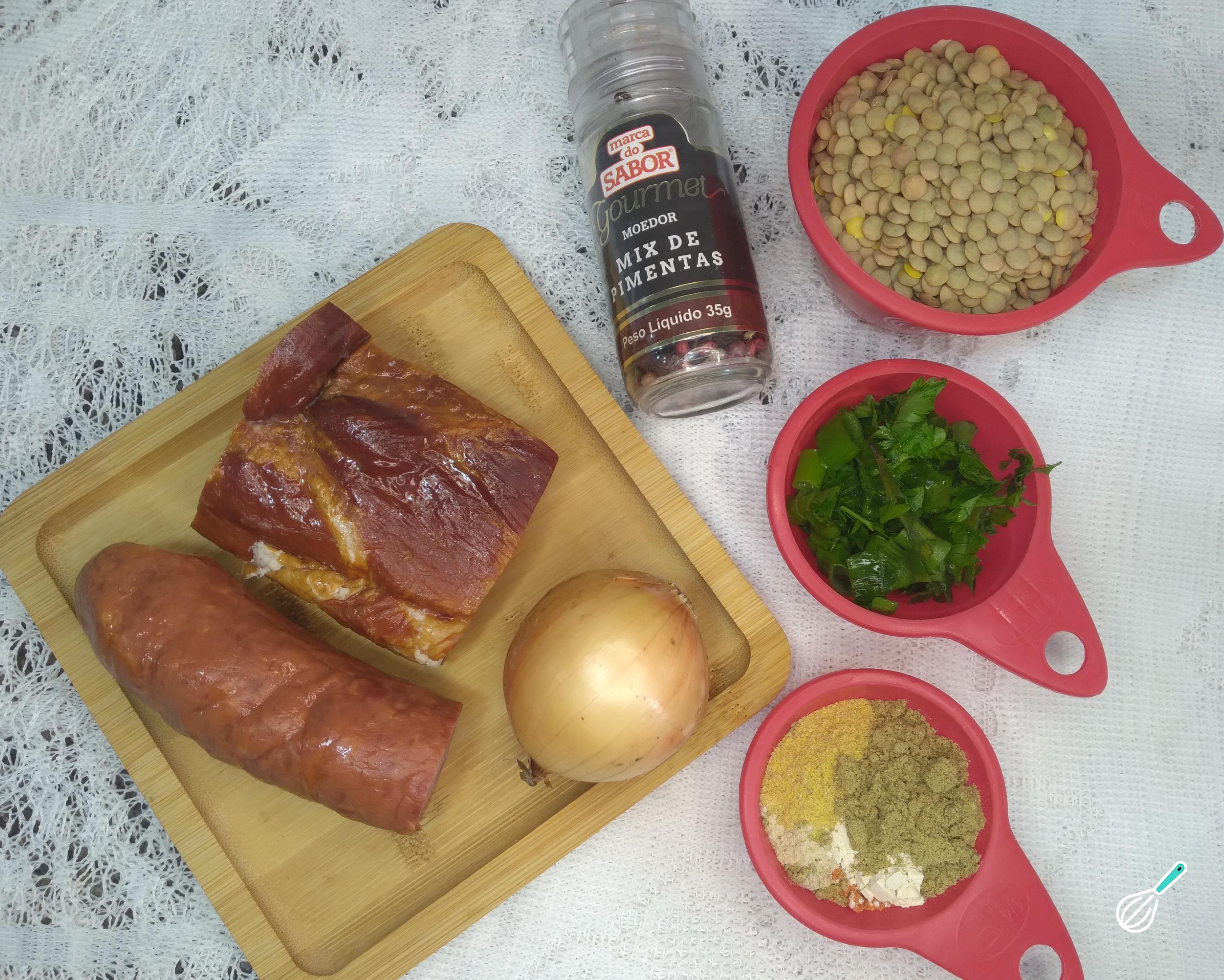 Separe o bacon, a linguiça calabresa, a cebola branca, a lentilha e os temperos.