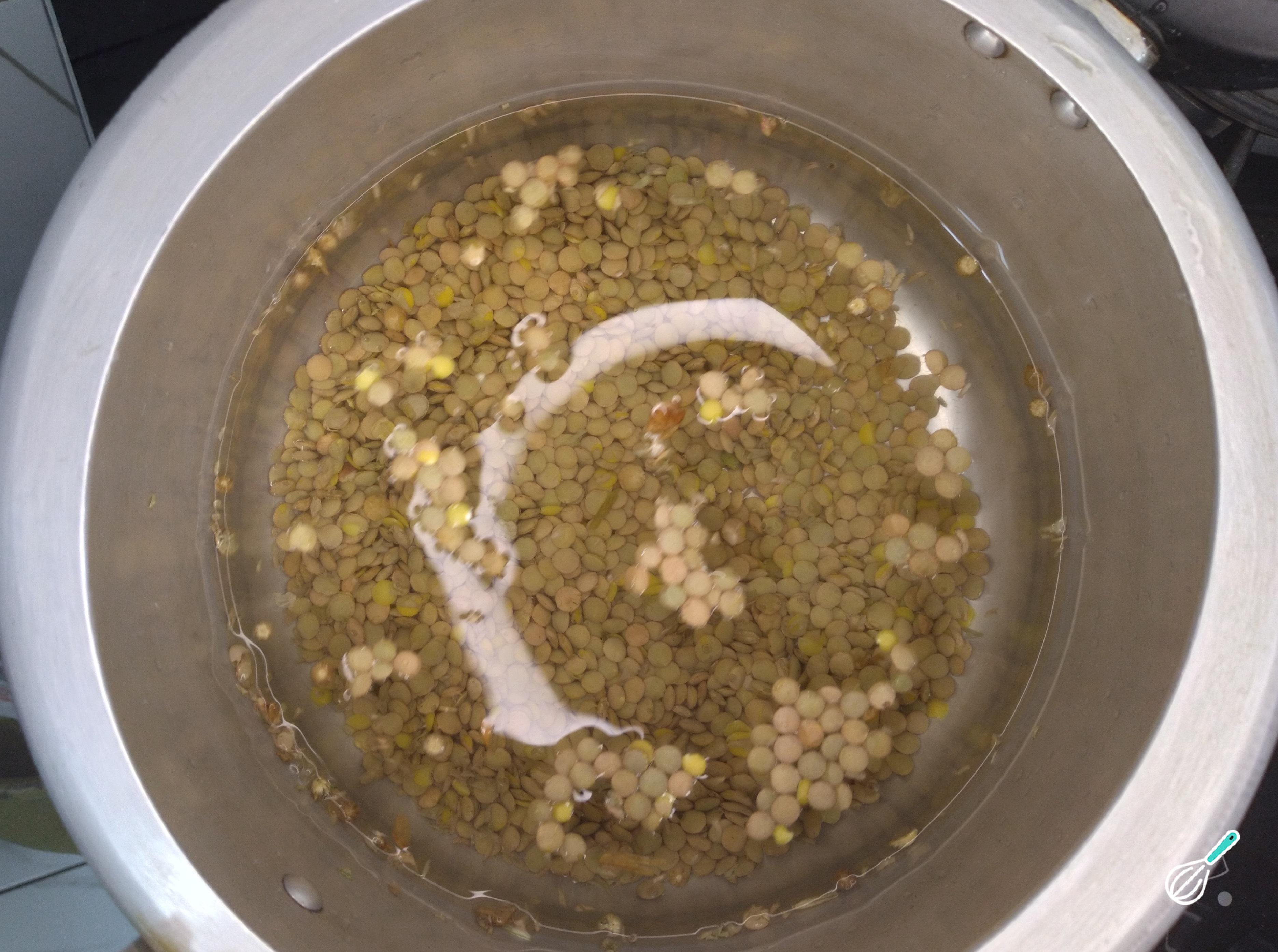 Feito isso, coloque a lentilha na panela de pressão para cozinhar.
