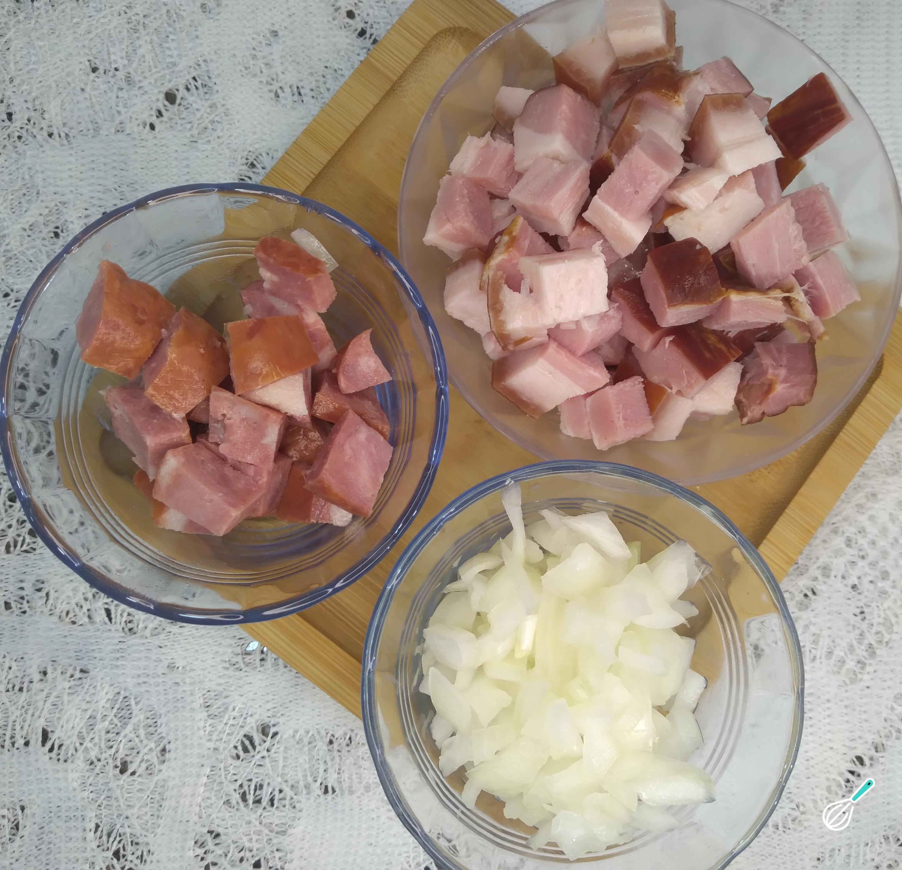 Enquanto a lentilha cozinha, corte o bacon, a linguiça calabresa e a cebola.