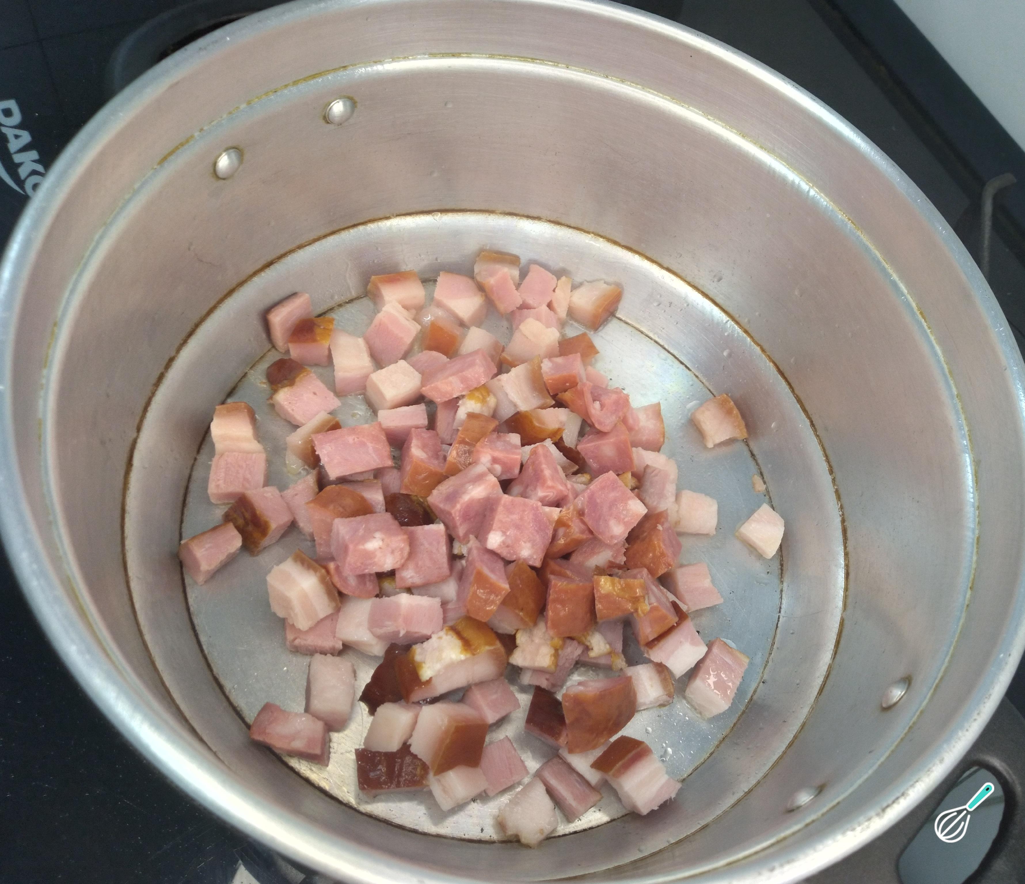 Em uma panela, coloque o óleo de soja e acrescente o bacon e a linguiça calabresa para fritar.
