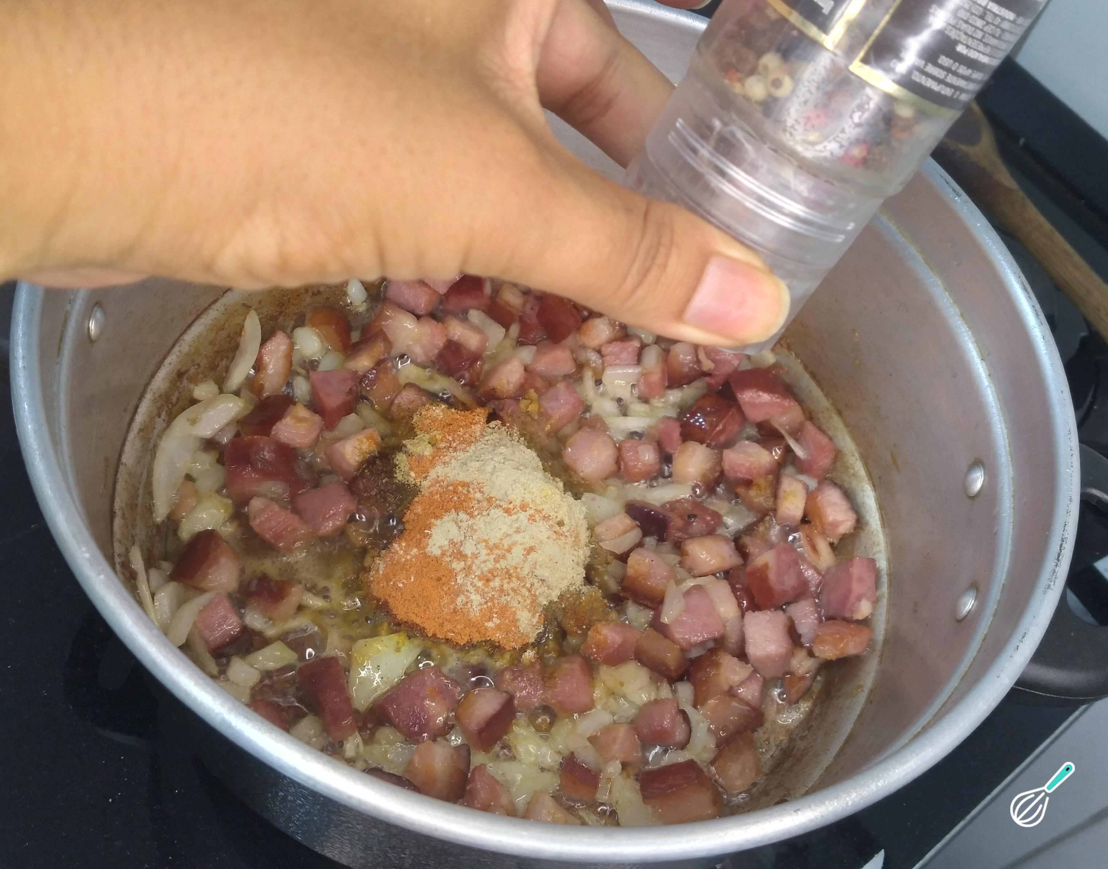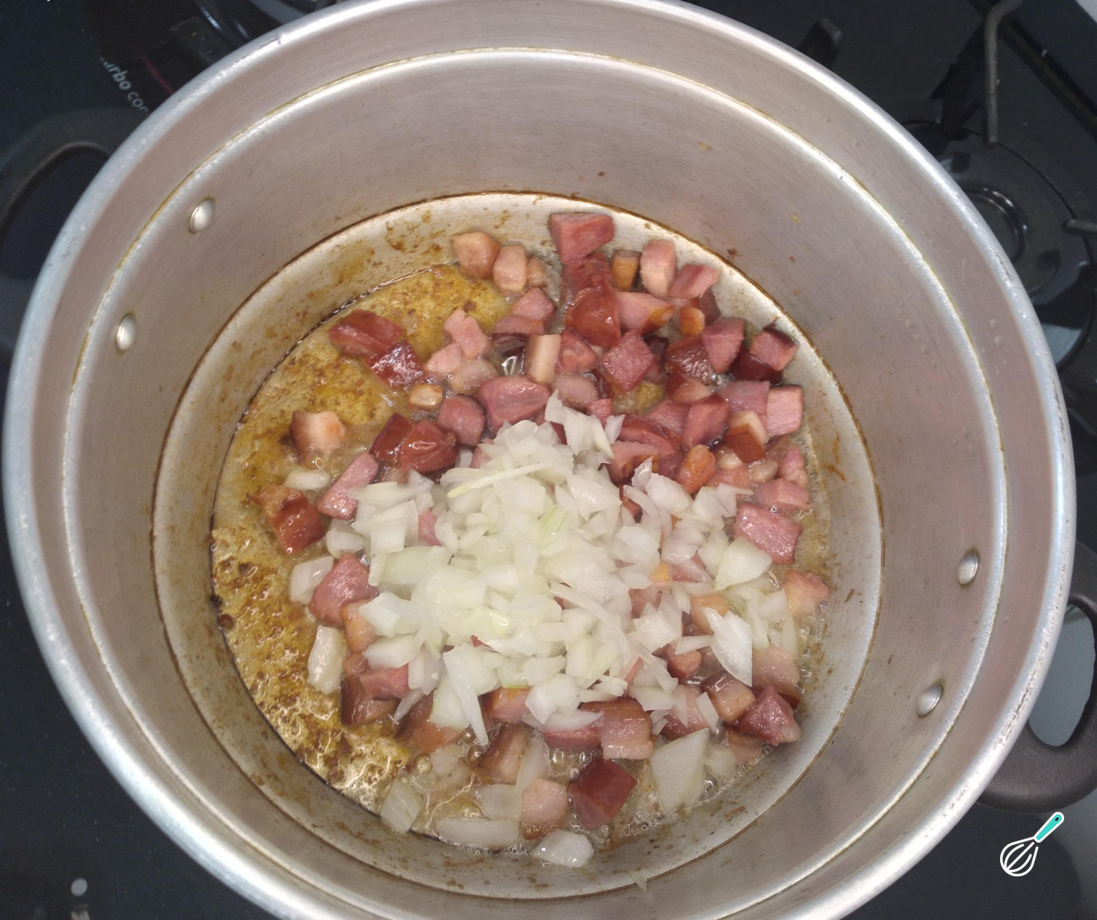 Quando o bacon e a linguiça estiverem fritos, acrescente a cebola branca cortada.