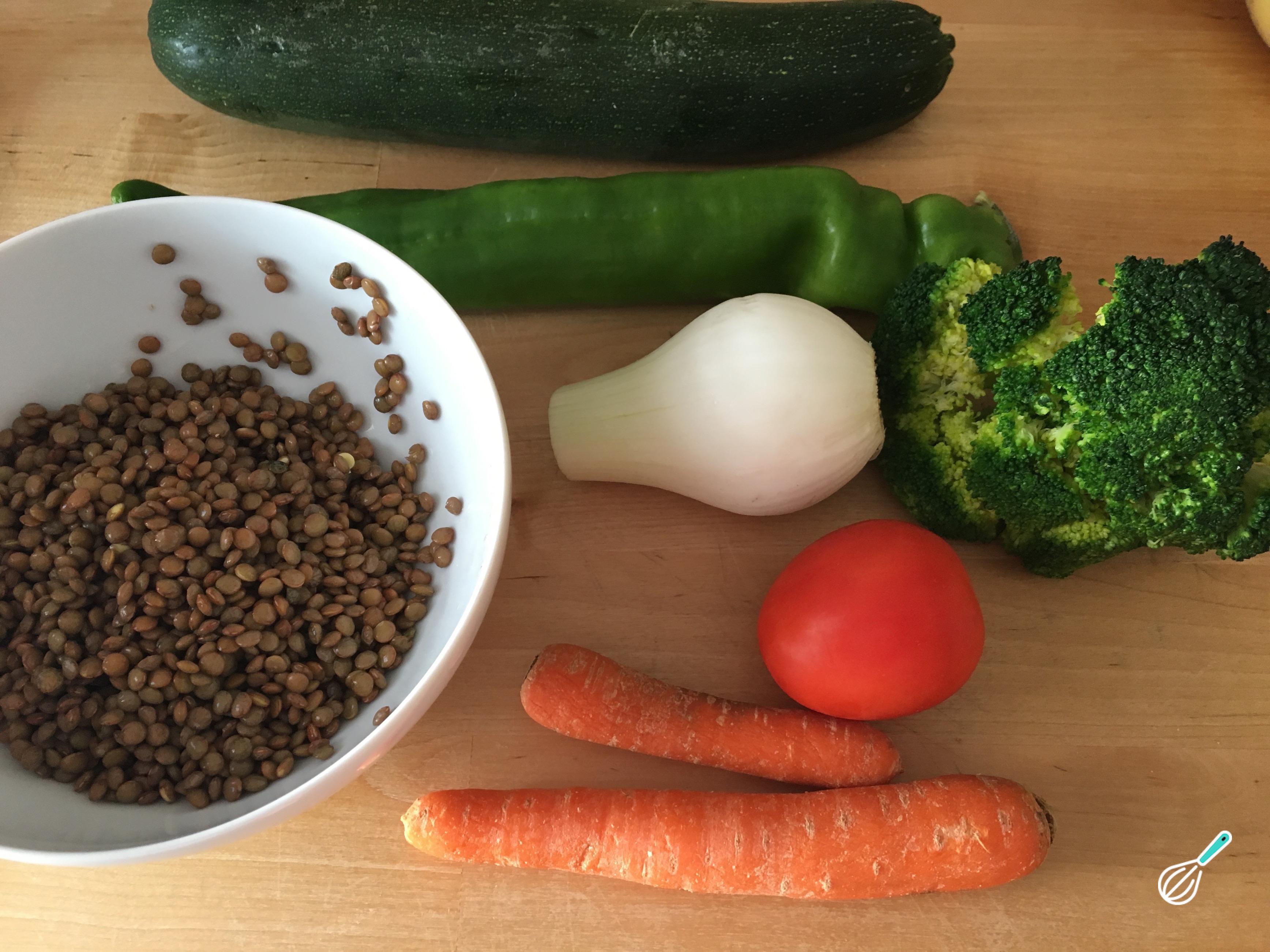 Para preparar esta receita de lentilha com legumes vegana, junte todos os ingredientes necessários para que assim seja mais rápido de preparar esta receita.
