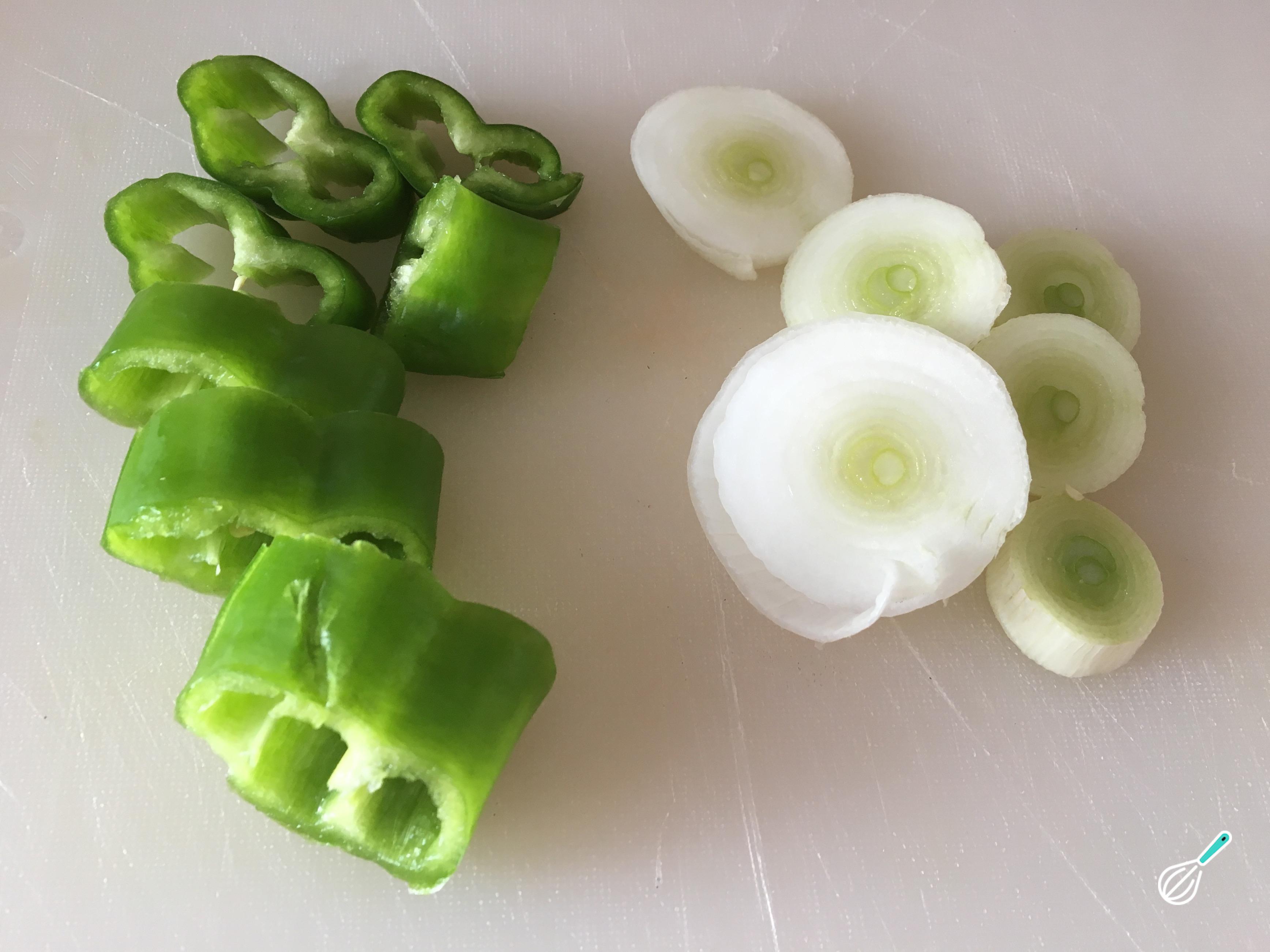 Corte a cebola e o pimentão verde em rodelas. Coloque em uma panela azeite, adicione a cebola e o pimentão e deixe refogar, até que comece a dourar, por aproximadamente quatro minutos.
