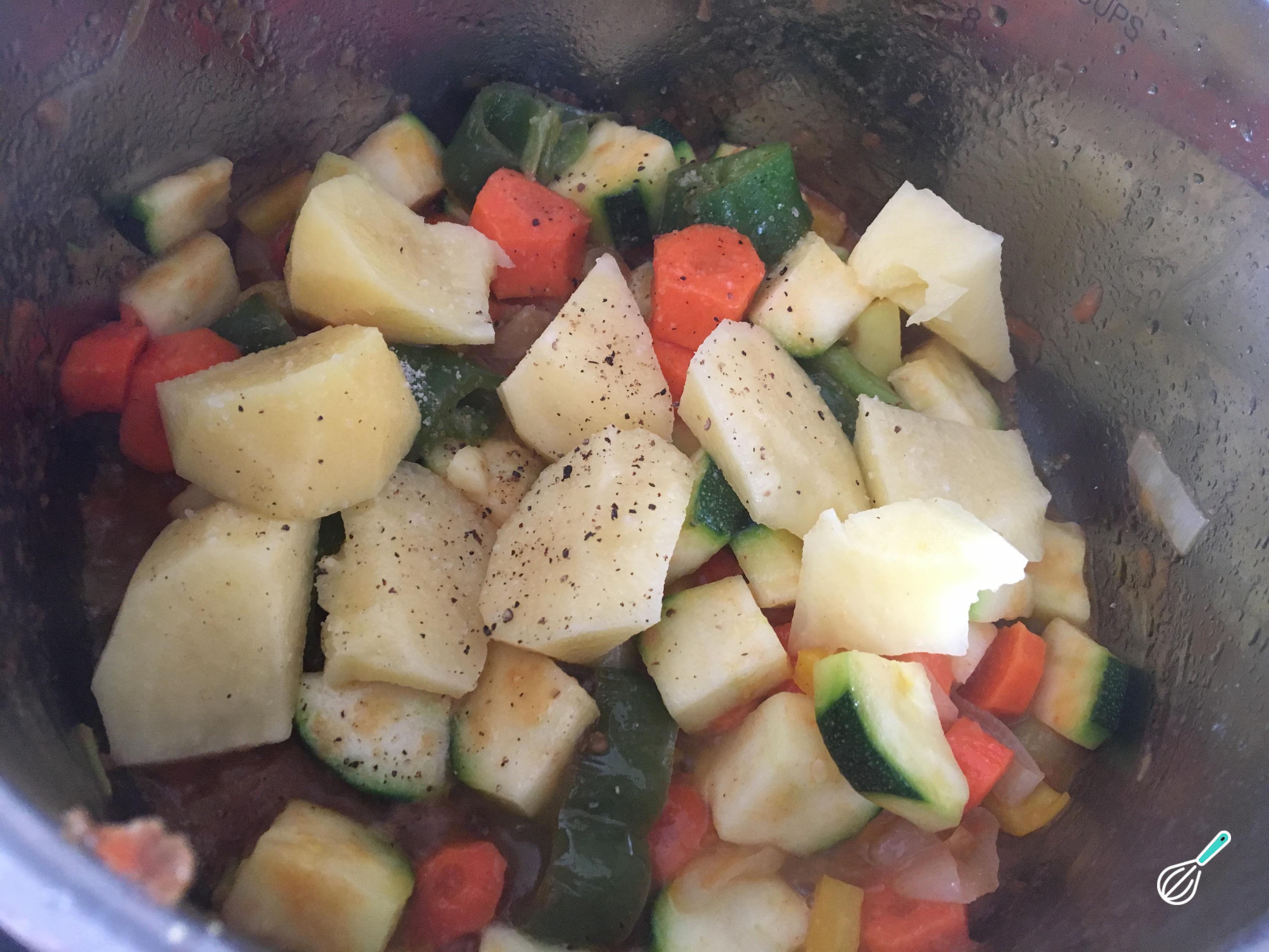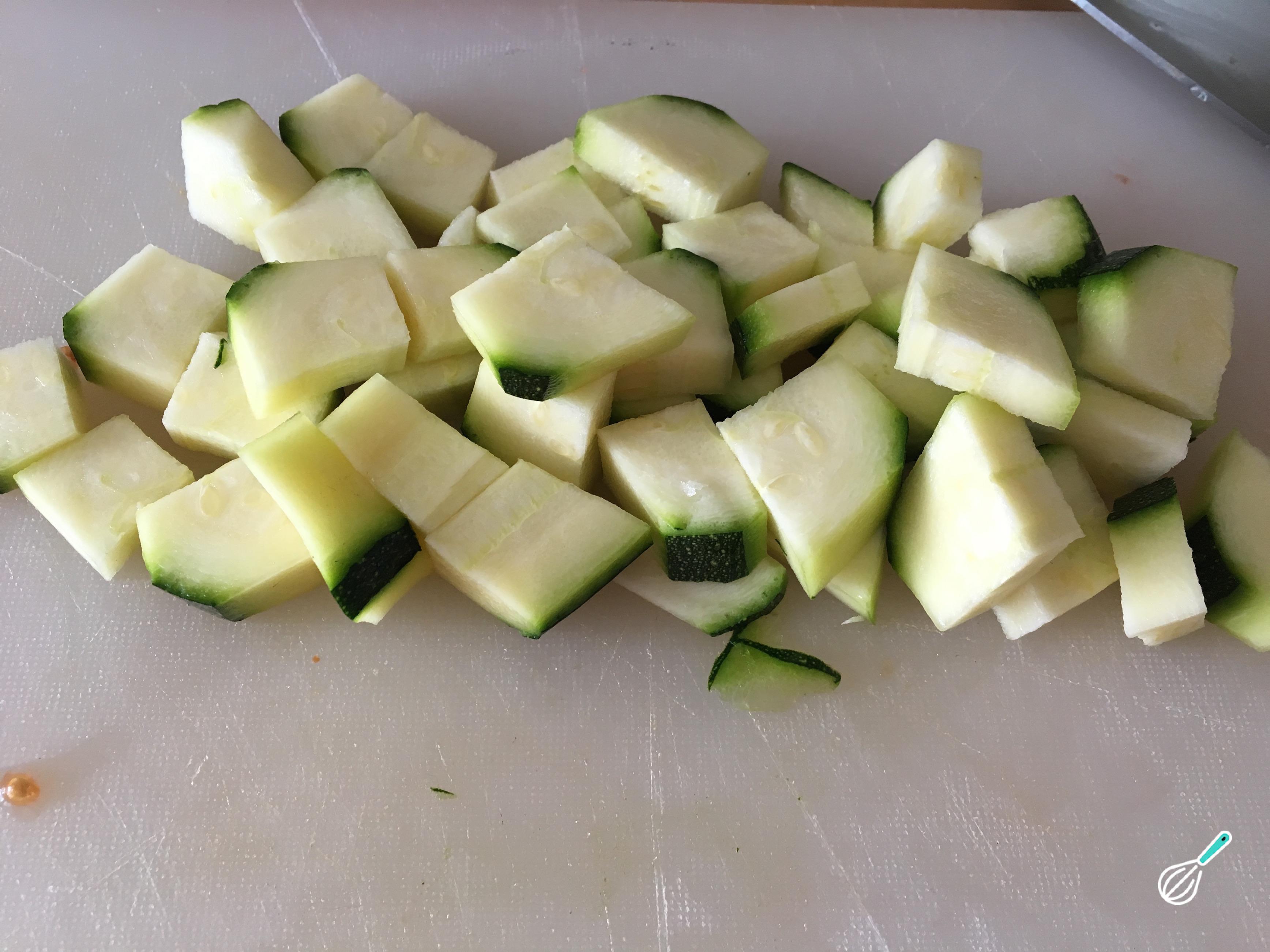 Lave e descasque a abobrinha, deixando um pouco de pele e corte em pedaços pequenos. Adicione a abobrinha à panela e deixe que cozinhe por quatro minutos.