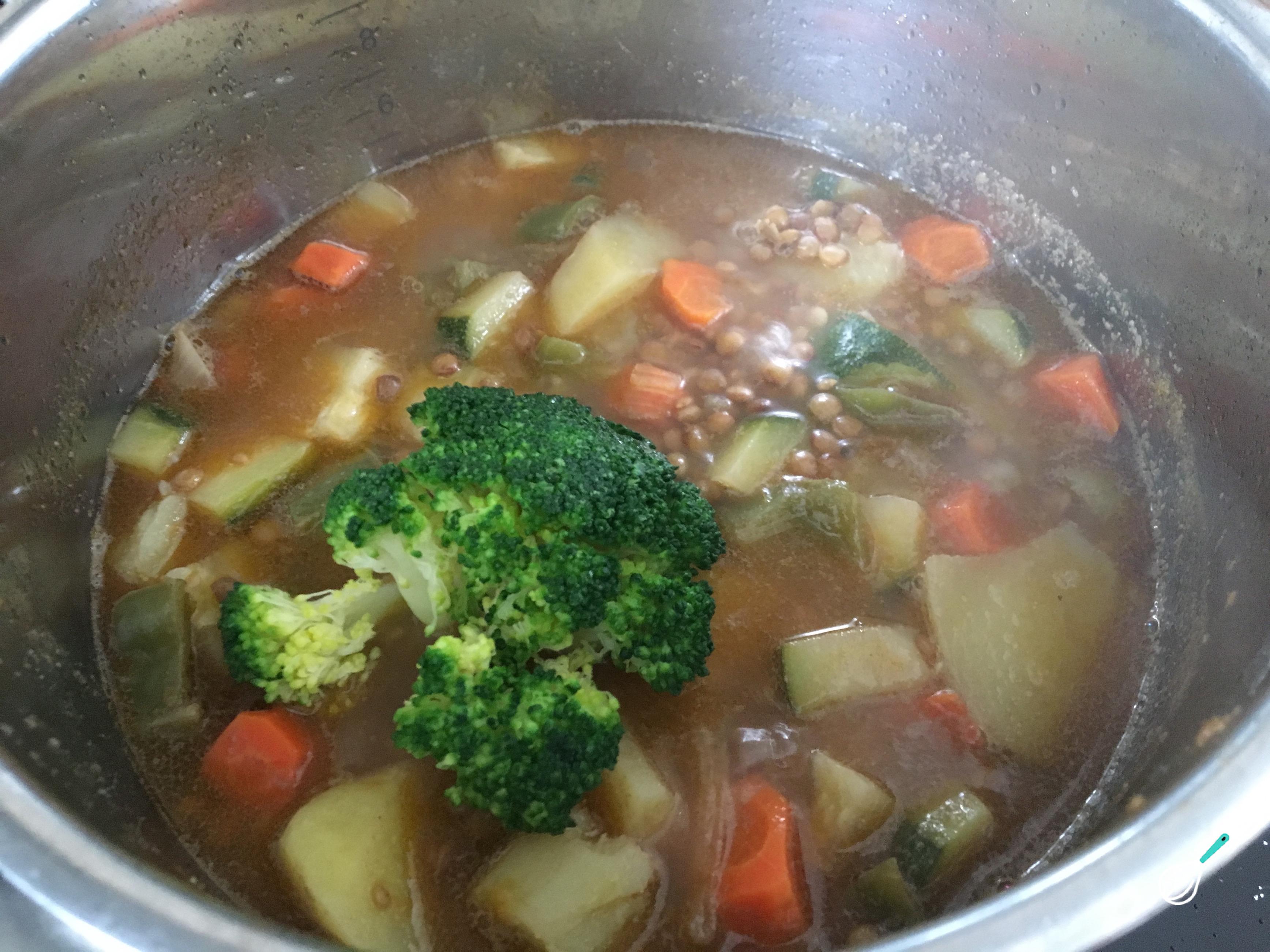 Um pouco antes de terminar o tempo de cozedura das lentilhas, junte os brócolis cortados ao refogado de legumes e retire do fogo.