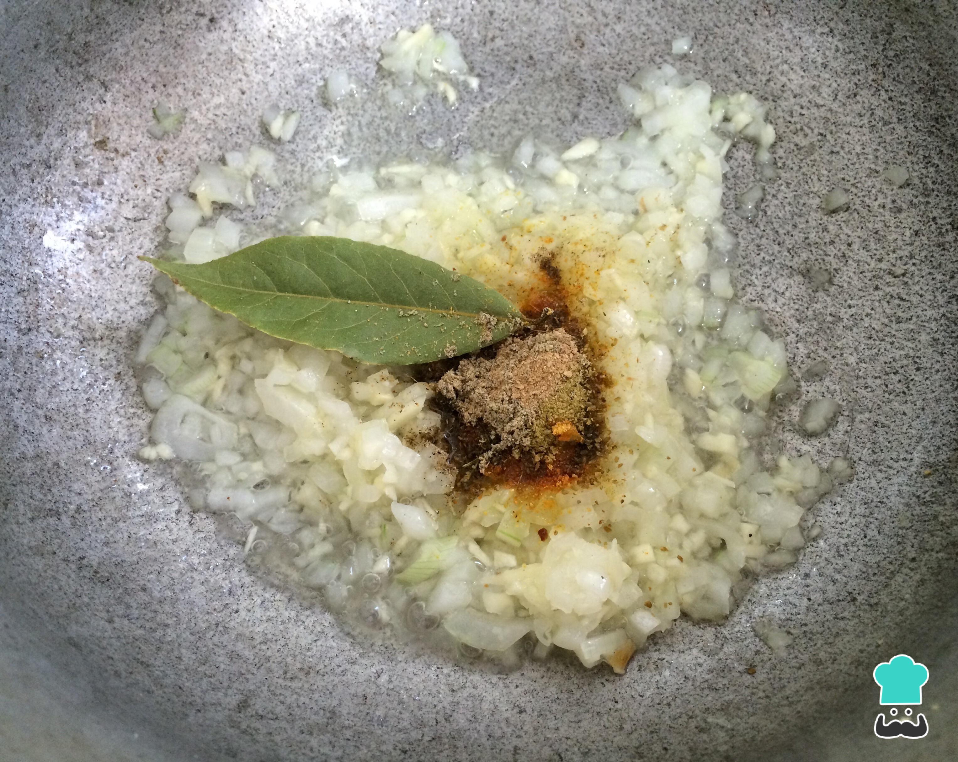 Em uma panela em fogo baixo com óleo, refogue a cebola e alho, até a cebola ficar macia. Acrescente a folha de louro e as especiarias, e misture tudo.