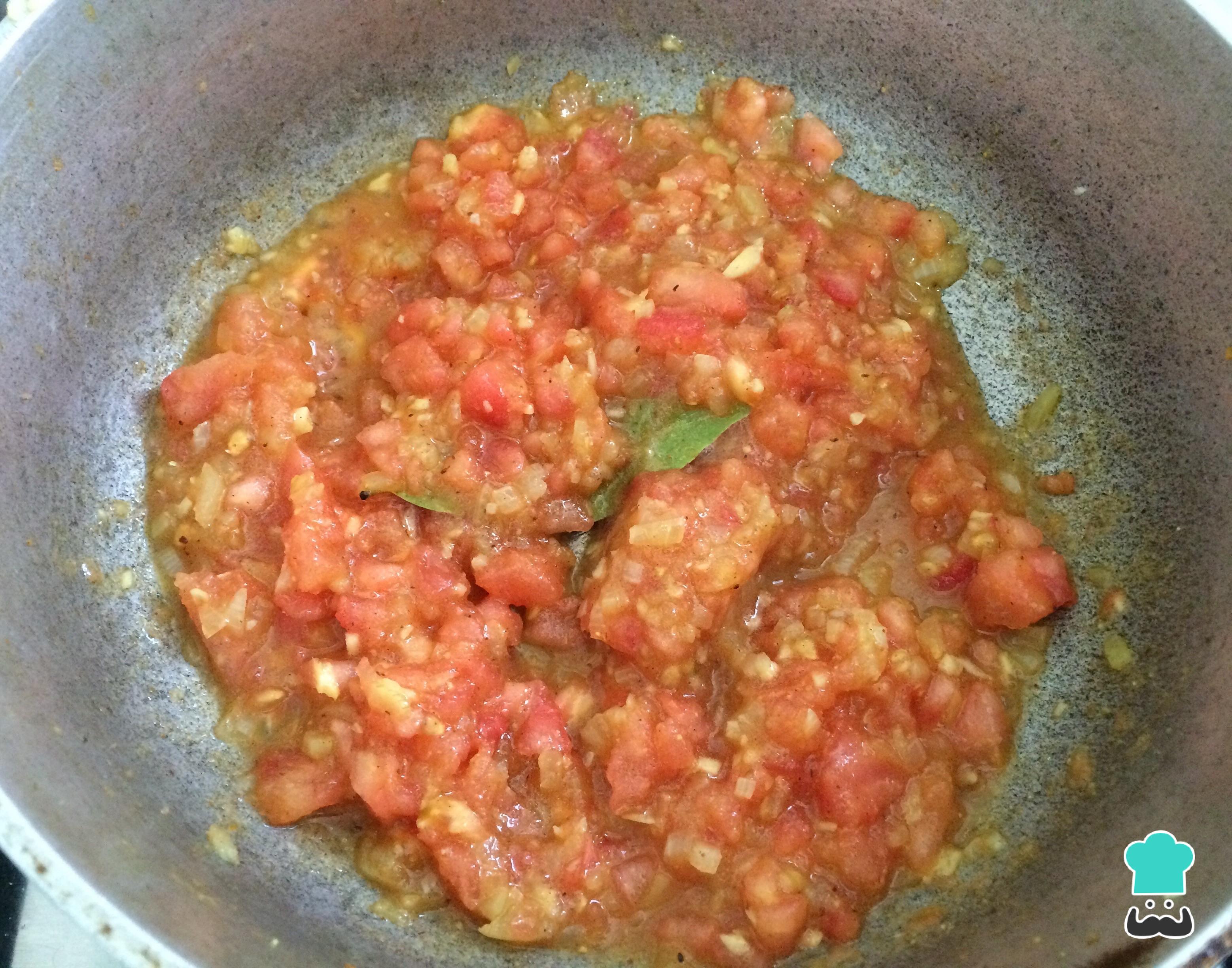 O passo seguinte é acrescentar os tomates e refogar em fogo baixo, com a panela tampada, até que se libertem os sucos deste ingrediente.