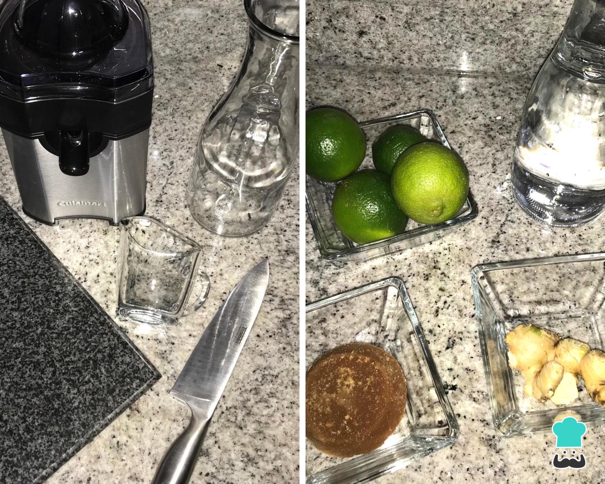 Comece por reunir os ingredientes necessários ao preparo desta receita de limonada caseira. Além deles você irá precisar de um espremedor de limão ou extrator de suco (opcional), uma tábua de corte, um copo, uma faca afiada e um jarro para servir ou armazenar o suco.