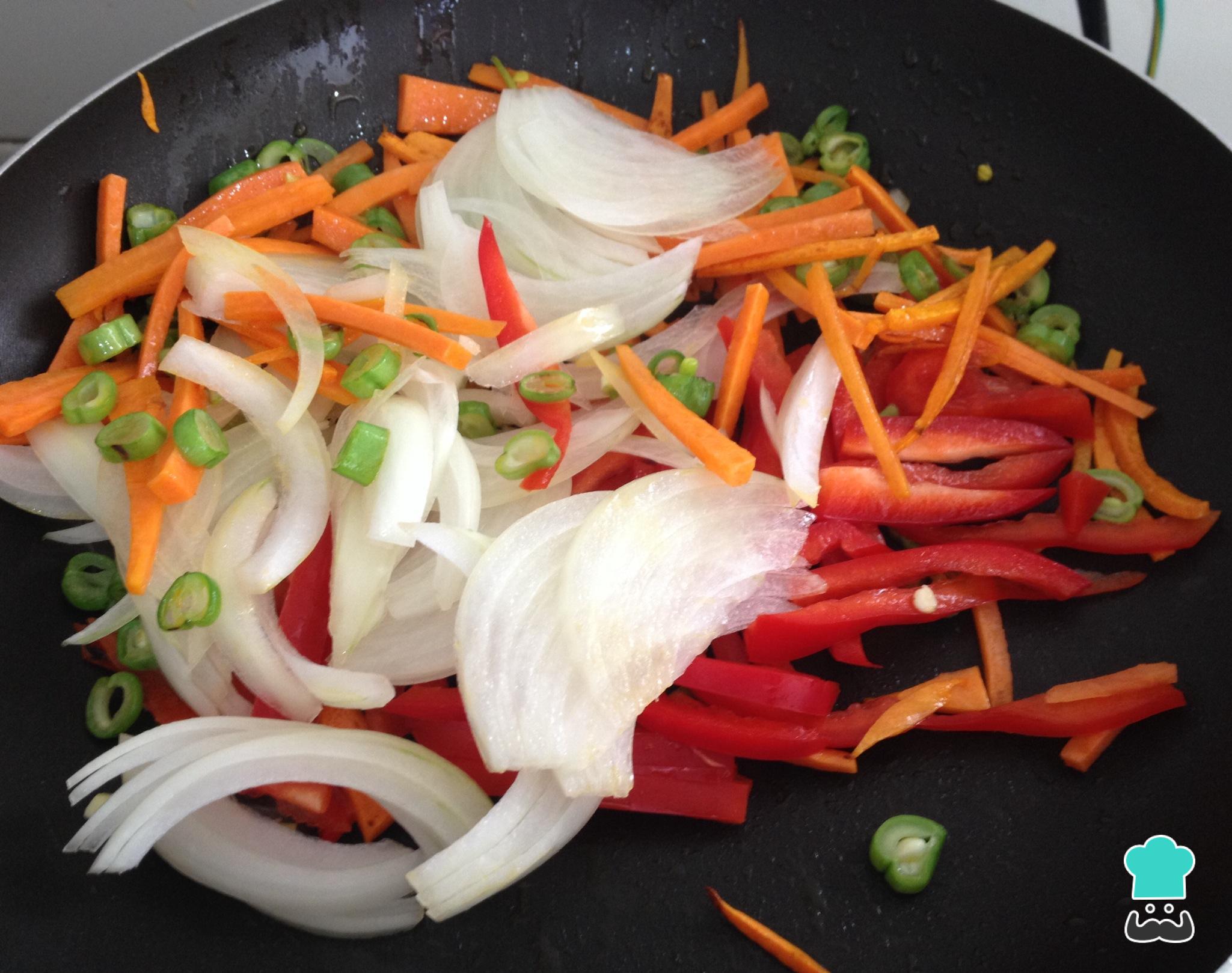 Prepare todos os ingredientes: corte a cenoura e o pimentão em juliana, a cebola em meias luas e a vagem em rodelas.