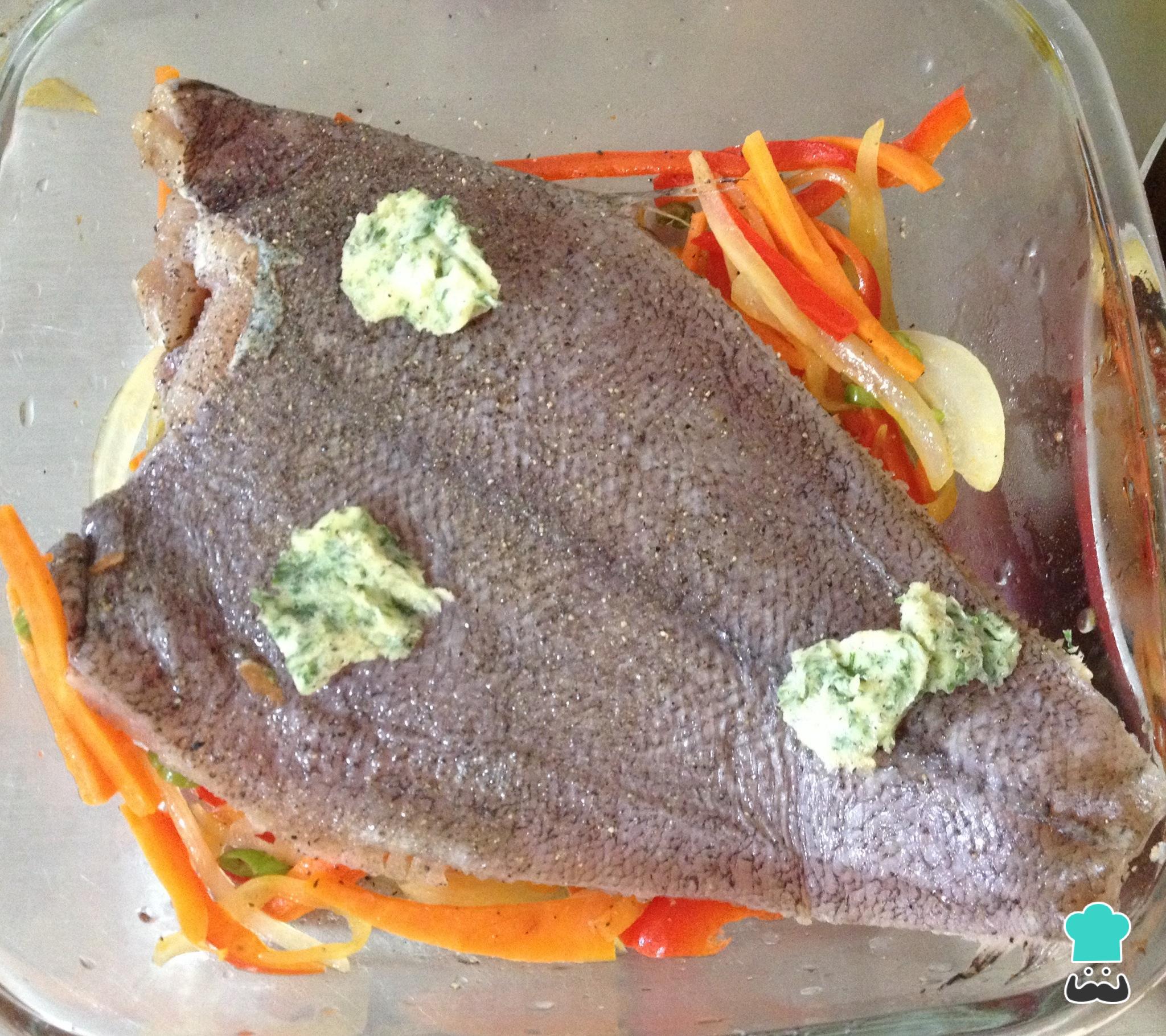 Em um refratário disponha metade dos legumes, algumas rodelas da manteiga anterior e o linguado previamente temperado com sal e pimenta. Adicione mais um pouco de manteiga.