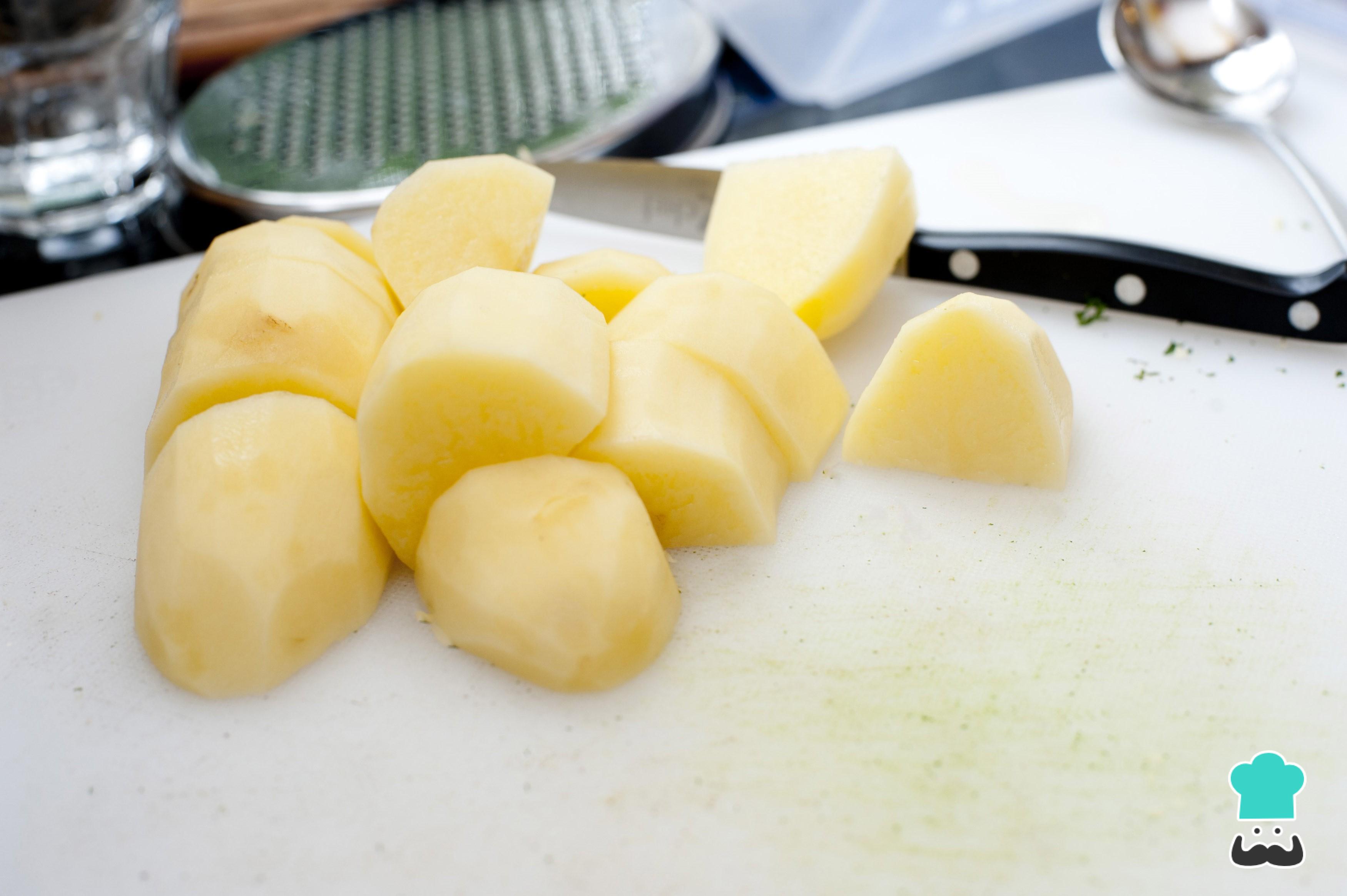 Comece por preparar os ingredientes: descasque e corte em pedaços as batatas rusticamente e a cebola em pétalas. Deixe as linguiças inteiras ou, se preferir, corte em pedaços também.