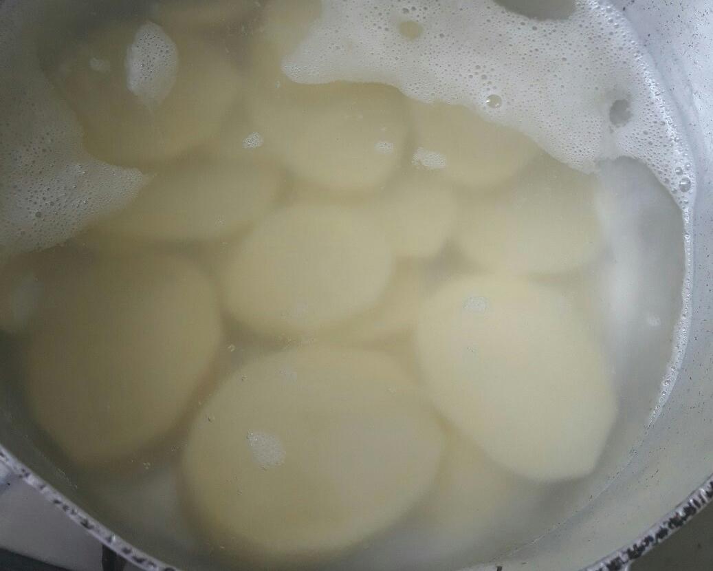 Em uma panela coloque água para ferver com um pouco de sal e azeite. Corte as batatas em rodelas (não muito finas) e coloque para cozinhar por mais ou menos 10 minutos.