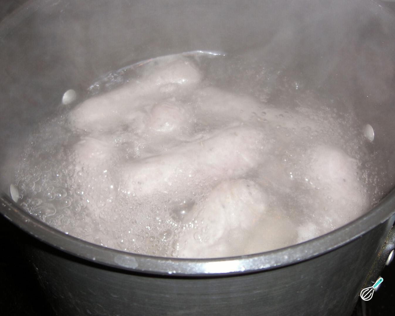 Tempere a linguiça com pimenta do reino e sal a gosto. Coloque na panela de pressão, adicione a água e tampe. Coloque para cozinhar no fogo médio.