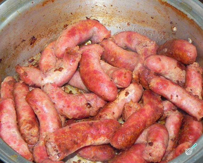 Quando a panela de pressão começar a chiar conte 5 minutos. Depois retire a panela do fogo, espere sair a pressão e abra. Devolva a panela ao fogo, coloque o óleo e fique mexendo a linguiça até ela ficar douradinha.