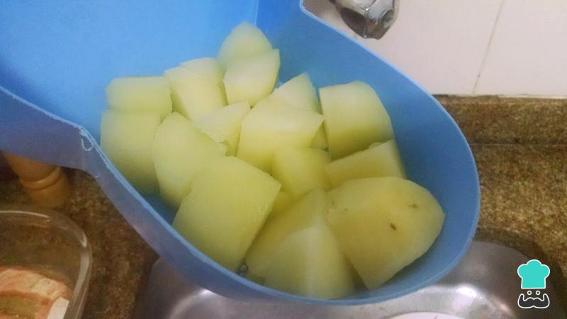 Para preparar esta receita de linguiça com batata, comece por descascar as batatas, cortar em pedaços e cozinhar numa panela com água por 15-20 minutos. O ideal é que as batatas estejam cozidas, mas ainda firmes.