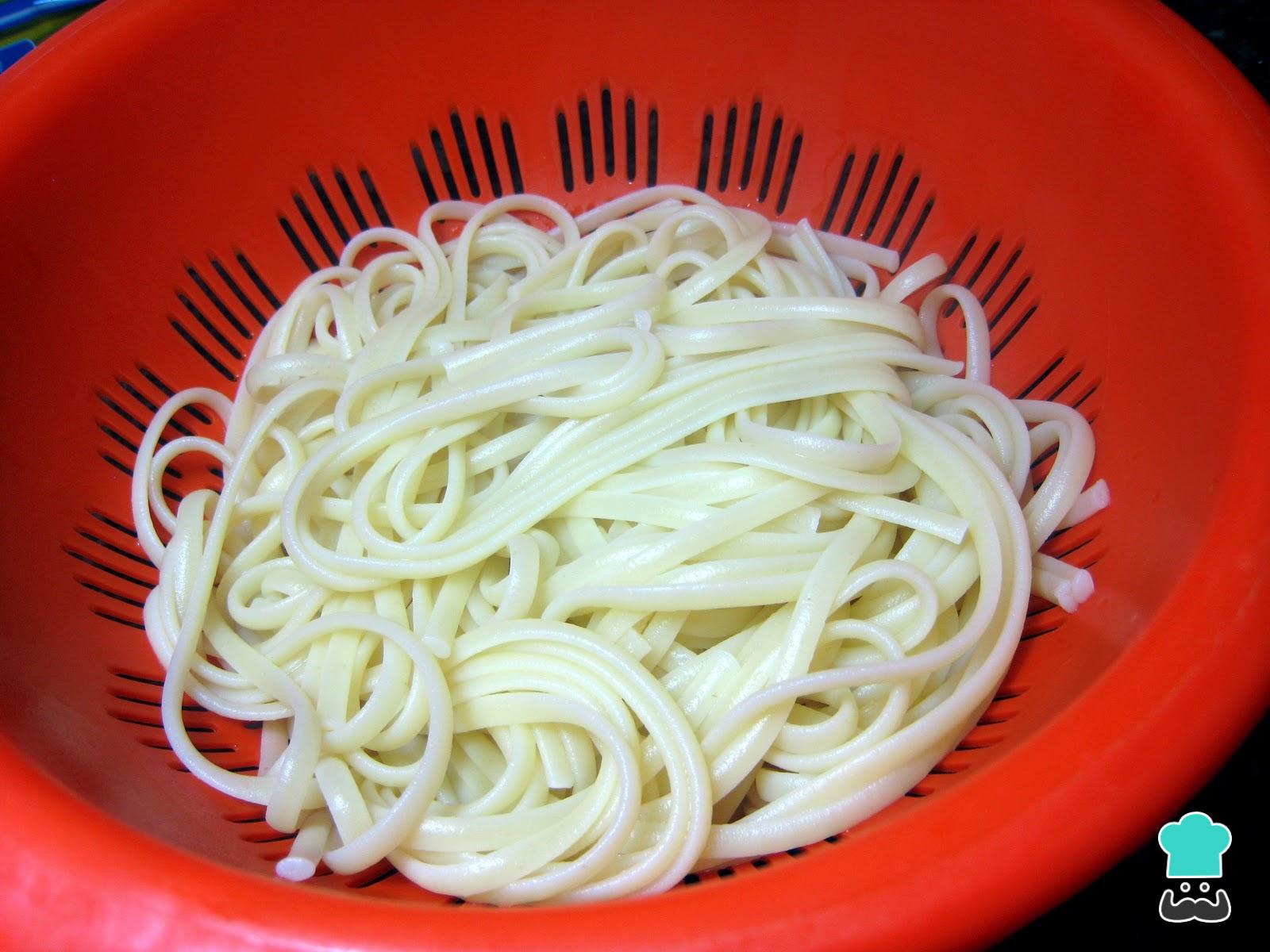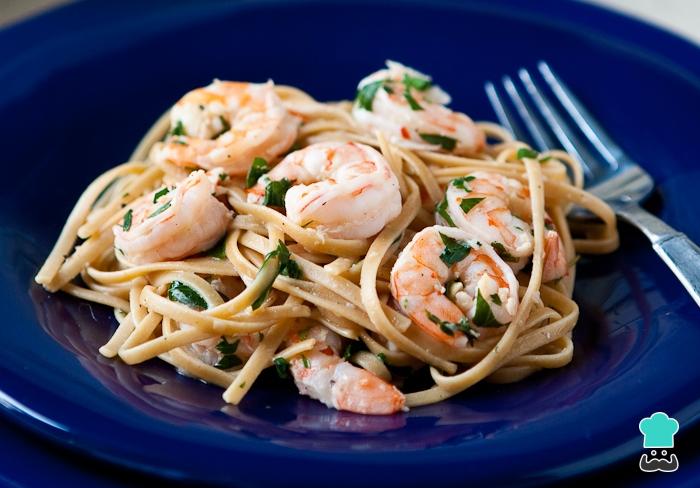 O primeiro passo desta receita com camarão, chamada nos EUA de shrimp scampi, é cozinhar o macarrão. Para isso leve ao fogo médio uma panela grande com água, um pouco de sal e um fio de azeite; quando a água ferver, cozinhe o macarrão até que fique al dente, escorra e reserve.