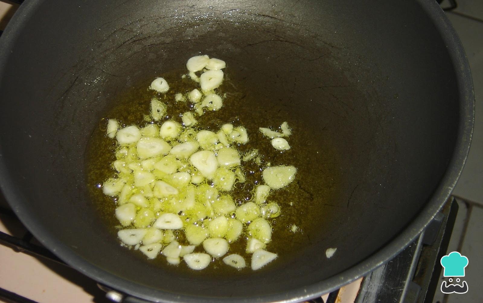 O passo seguinte desta receita do Buddy Valastro é, em uma frigideira quente, colocar o azeite, o alho fatiado ou amassado e a manteiga. Refogue em fogo médio sem deixar queimar o alho.