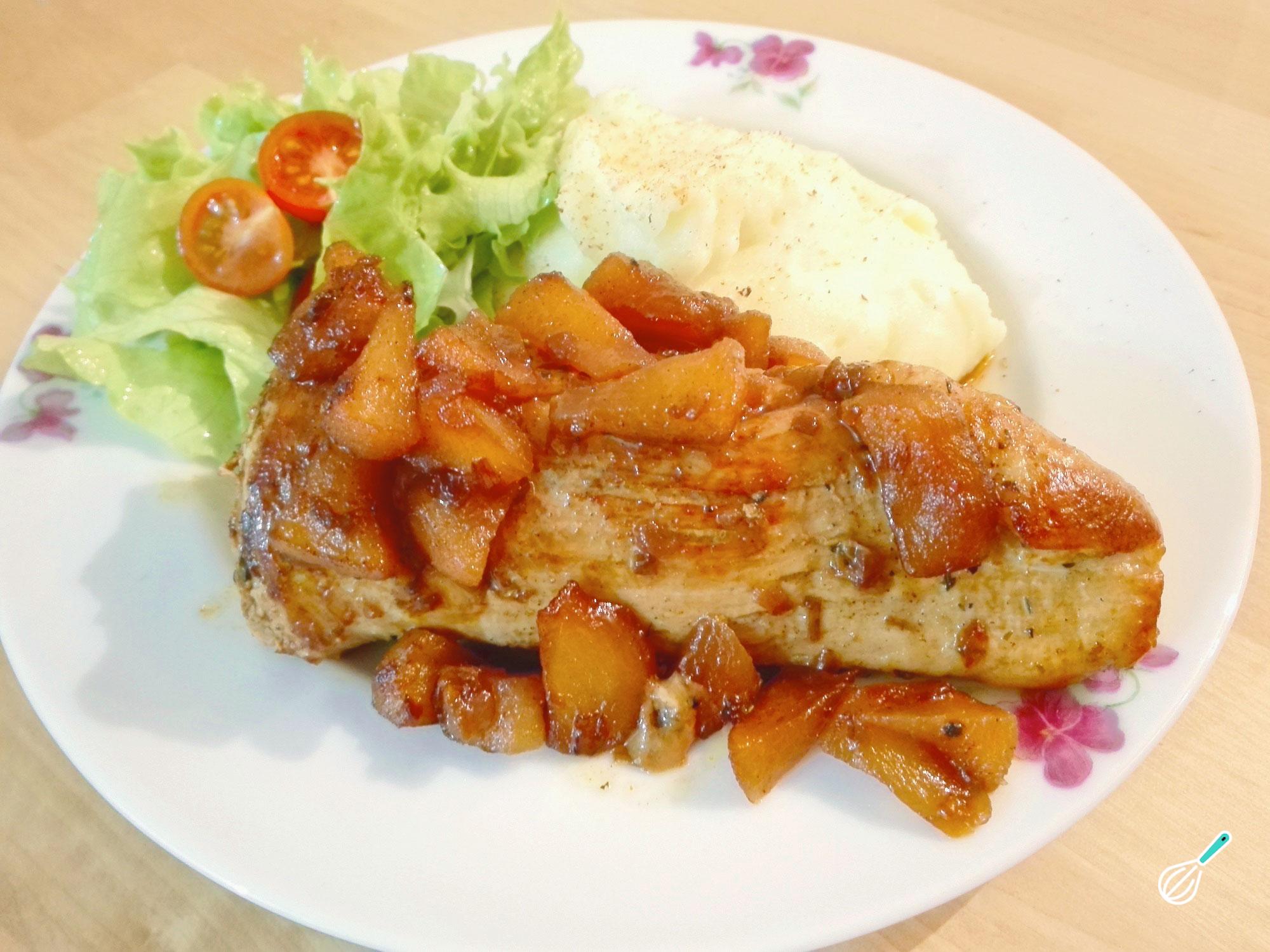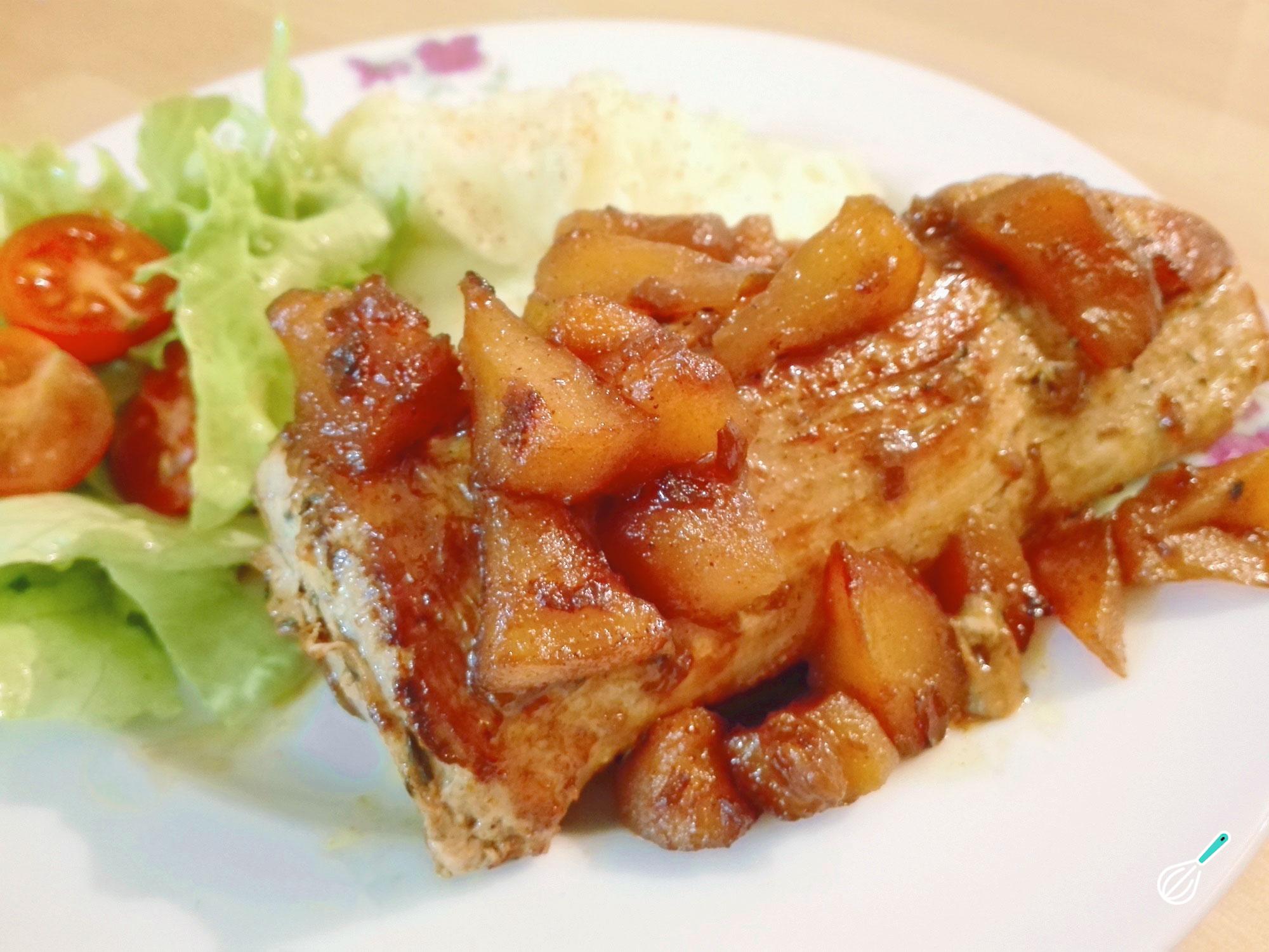 Seu lombinho de porco com chutney de maçã está pronto! Neste caso acompanhei com purê de batata e salada de alface e tomate cereja. Experimente esta receita rica em sabor, e diga-nos o que achou! Bom apetite.