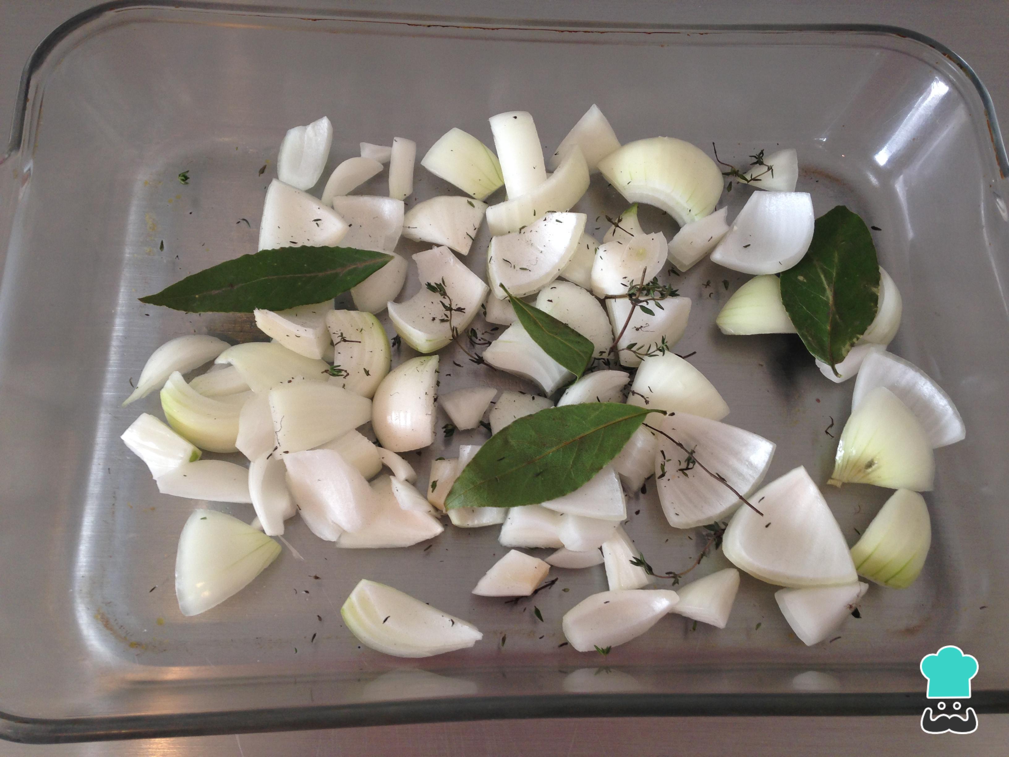 Disponha em um refratário as cebolas cortadas em meias luas, as folhas de louro e o tomilho.