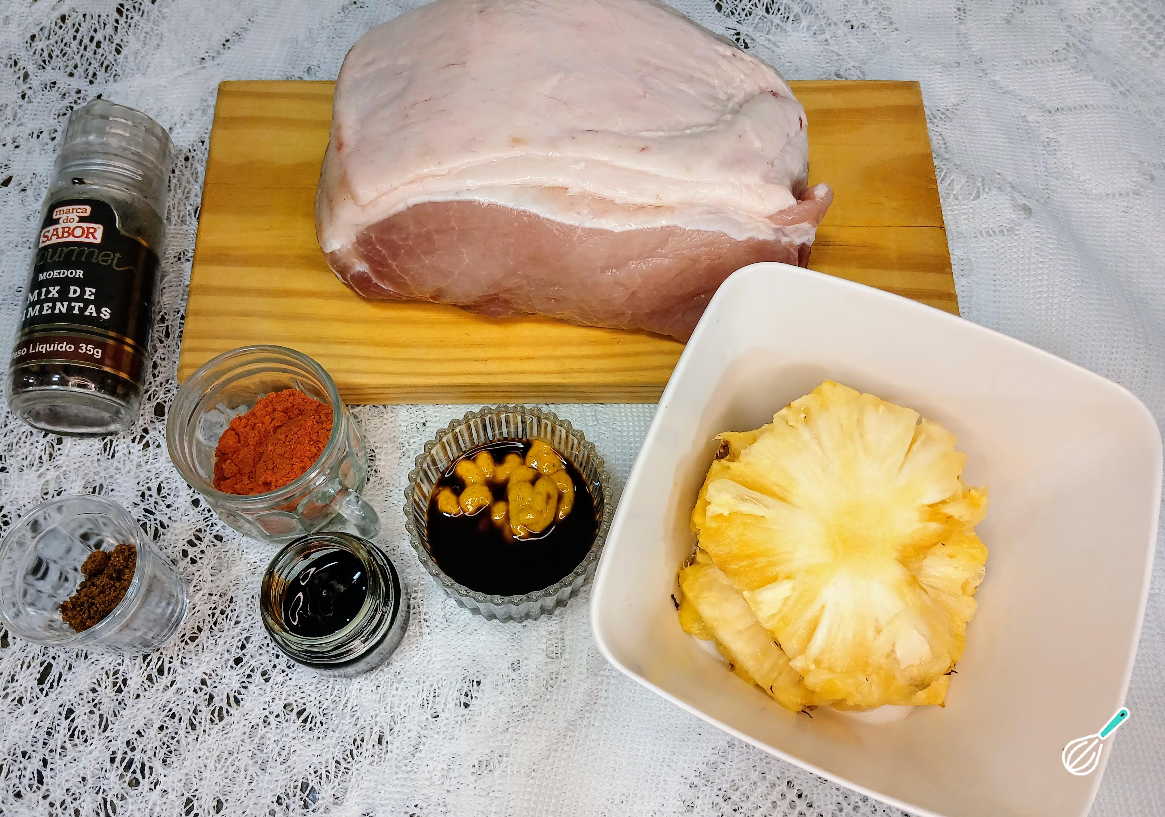 Comece separando os ingredientes para o preparo do lombo assado com abacaxi. Separe a peça de lombo de 1 kg, bem bonita e com a capa de gordura. Separe as rodelas de abacaxi bem maduro. Separe também os temperos alho em pó, cebola em pó, páprica picante defumada, cominho e gengibre. Separe os molhos para temperar o lombo e separe sal, pimenta e açúcar mascavo.