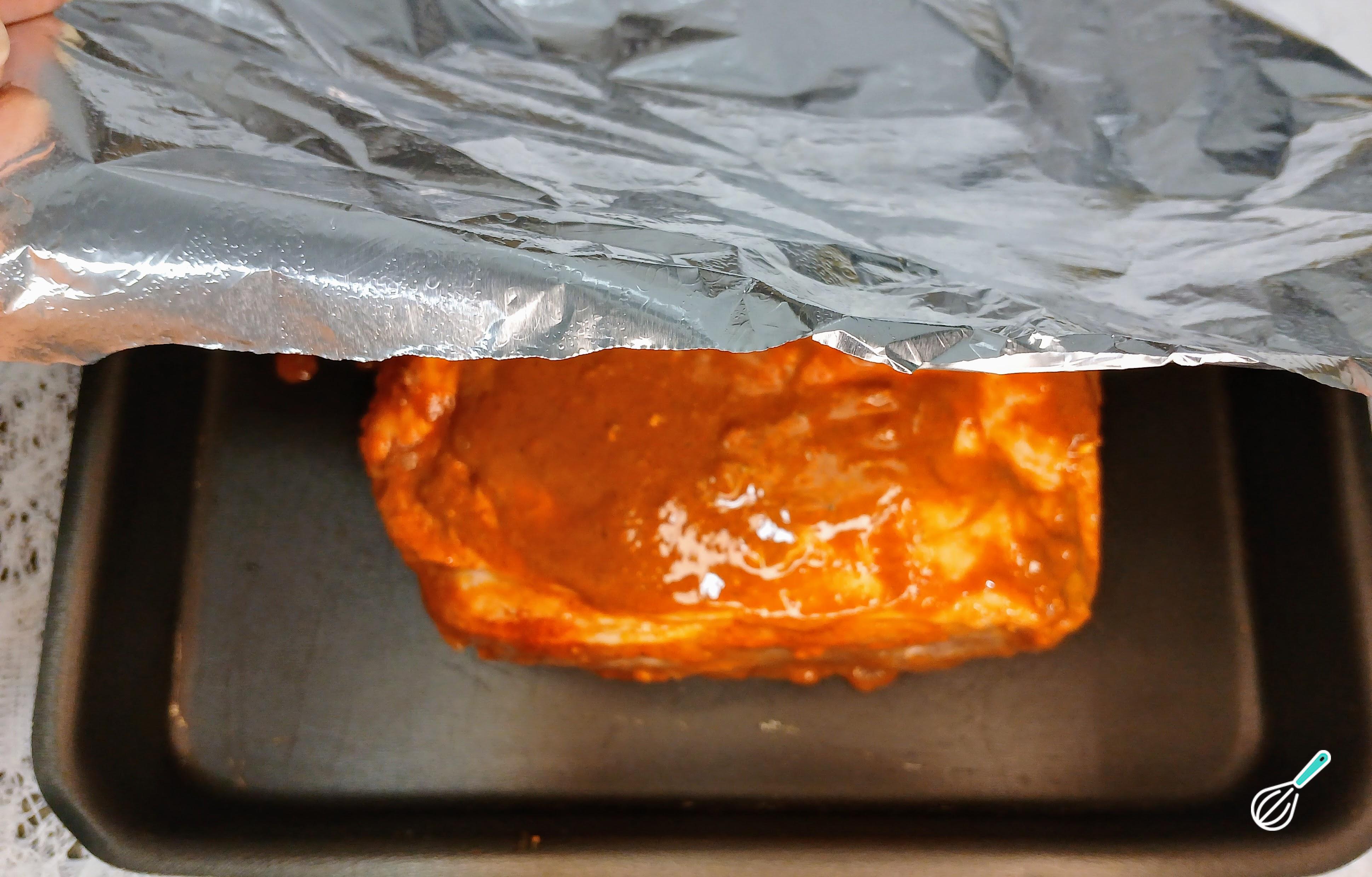 Feito isso, depois do tempo de pausa marinando, retire a carne da geladeira e disponha em uma assadeira antiaderente. Cubra com papel alumínio e leve ao forno pré-aquecido a 220 graus por 30 minutos.