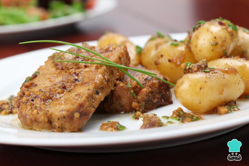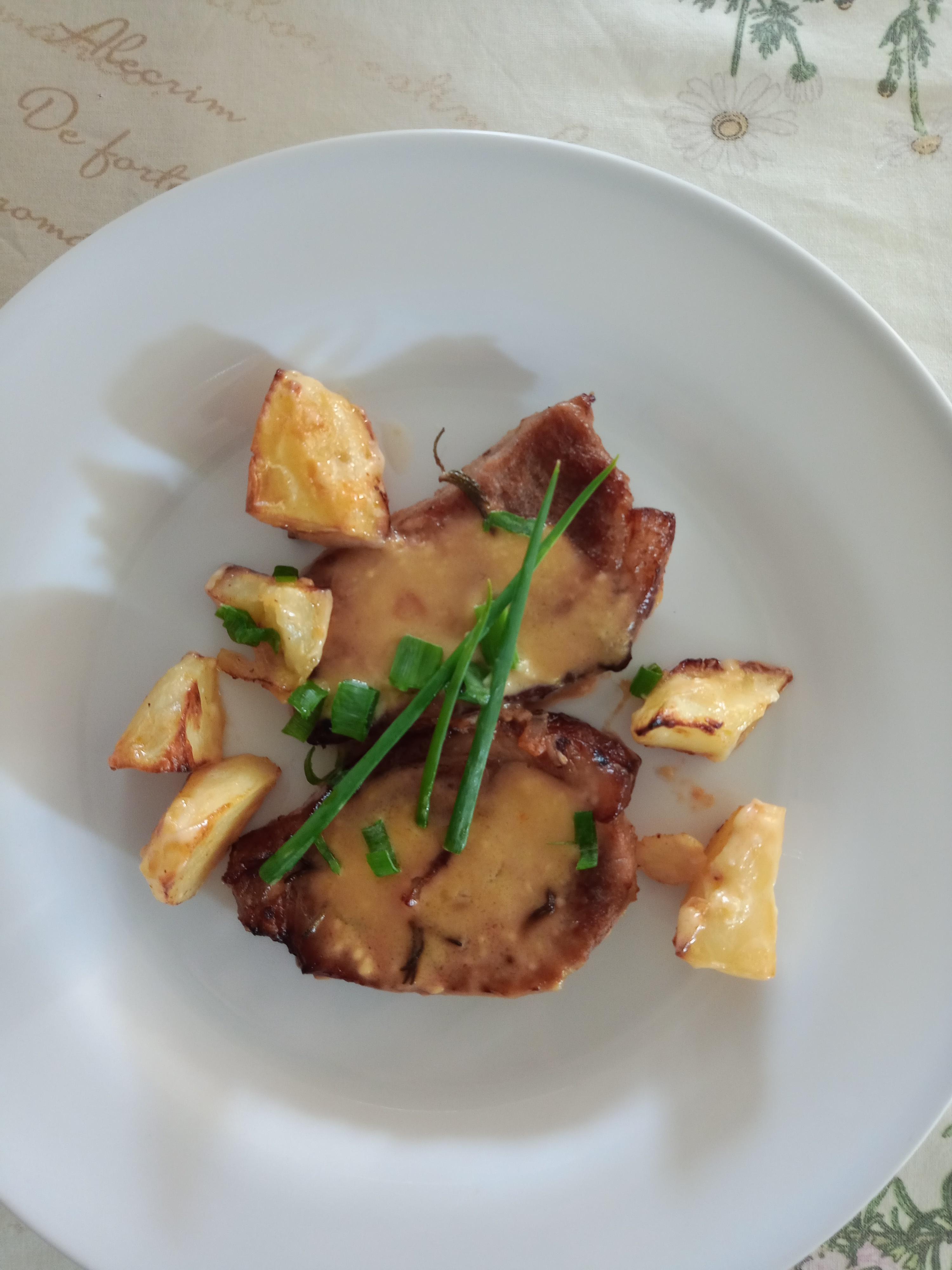 Seu lombo assado com batatas douradas está pronto a comer! Acompanhe este preparado delicioso com uma salada verde e desfrute!