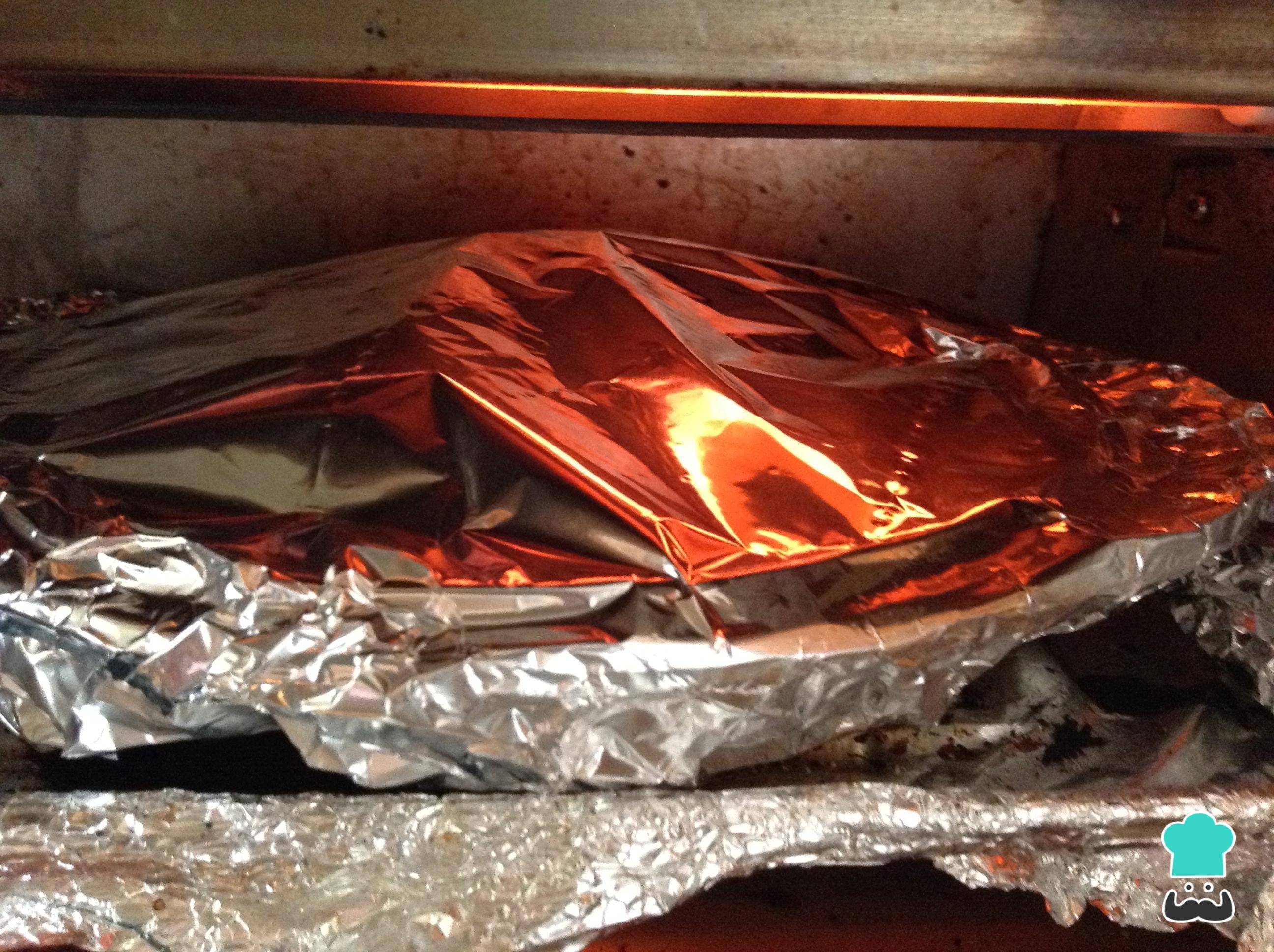 Em seguida, coloque o lombo em uma assadeira, com as batatas em volta, e regue tudo com a marinada do passo anterior. Cubra a assadeira com papel alumínio e asse em forno médio por 30 minutos.