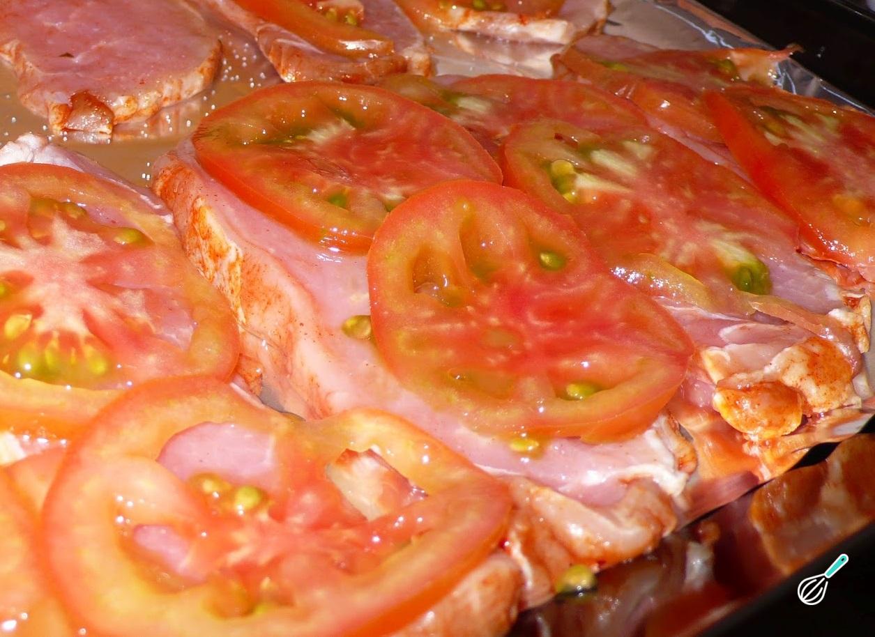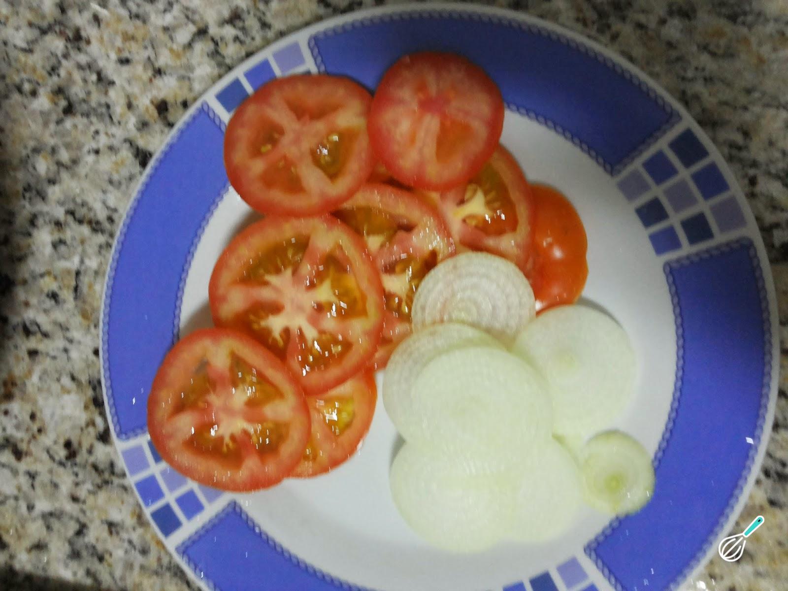 Para fazer lombo canadense, comece por cortar o tomate a cebola em rodelas. Tempere com vinagre, açúcar, sal, pimenta do reino e orégano.