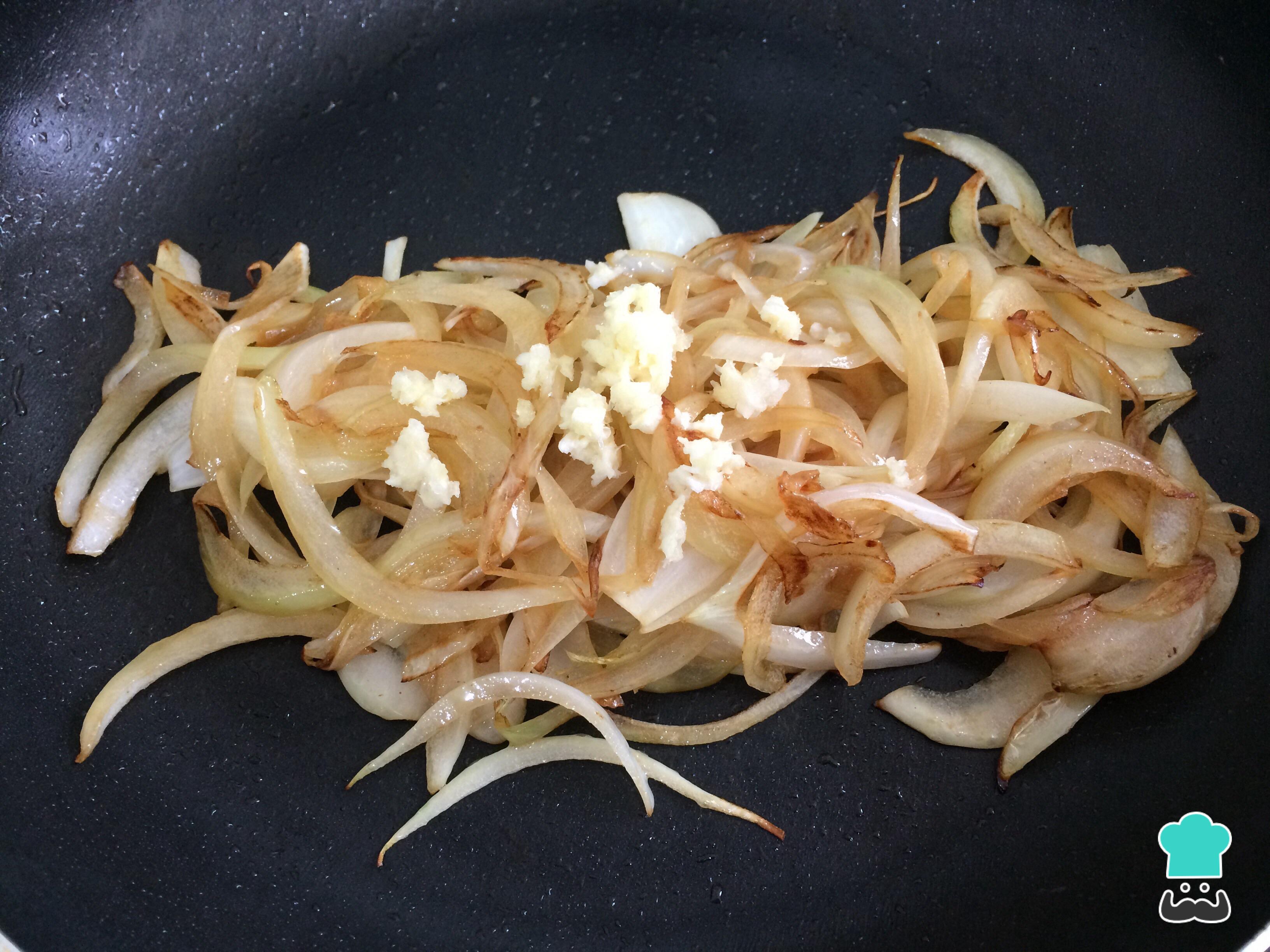 Para continuar preparando o creme de cebola, adicione o alho picado, misture, e deixe refogar um pouco. De seguida acrescente o vinho e mexa, para libertar os sabores.