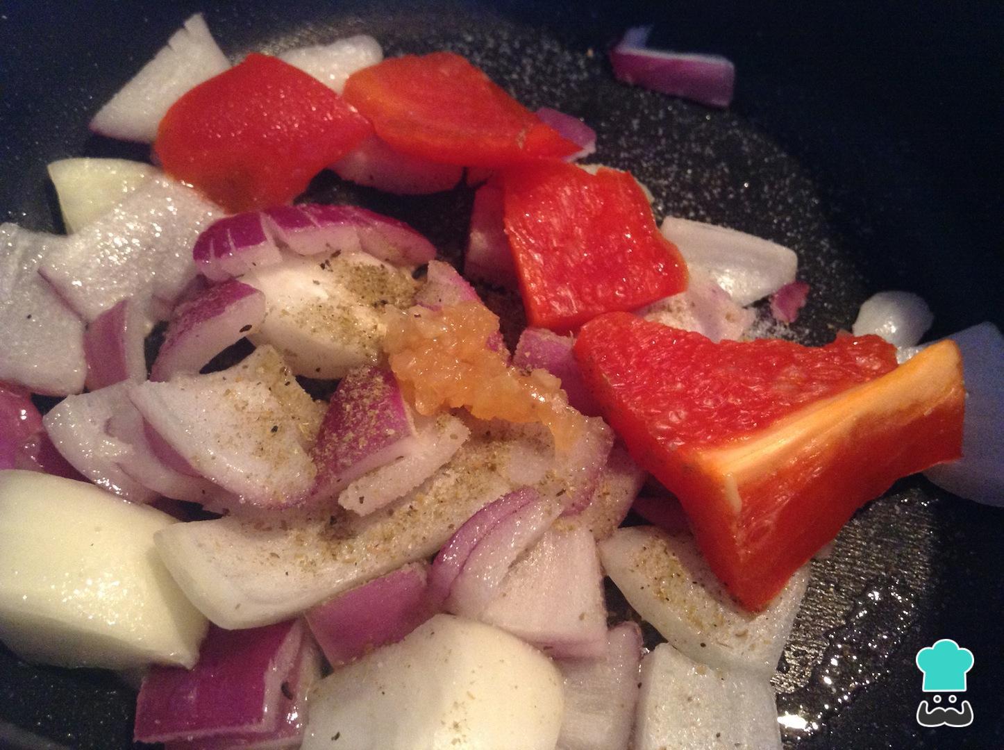 Leve uma panela funda ao fogo médio e adicione uma colher de chá de azeite de oliva. Refogue a cebola e o pimentão cortados em pedaços grandes e adicione o sal, pasta de alho e pimenta do reino a gosto.