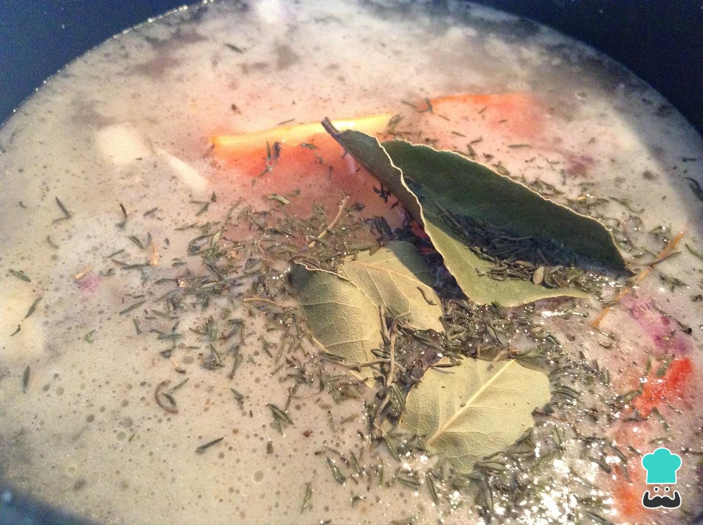 Adicione a folha de louro e tomilho para dar mais sabor. Assim que o caldo base ficar pronto, passe pela peneira para coar os sólidos. Reserve.