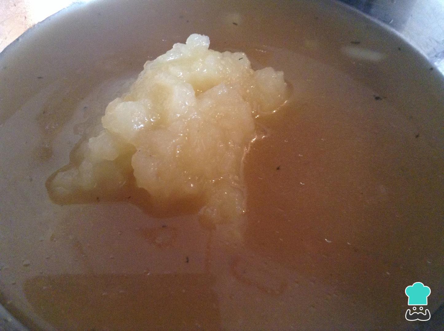 Descasque e corte as maçãs em cubos médios. Coloque-as em uma panela com água a fogo médio e cozinhe até ficarem macias. Processe ou triture a maçã até obter um purê, junte o caldo da etapa anterior, a manteiga e misture bem. O molho deve ficar bem espesso.